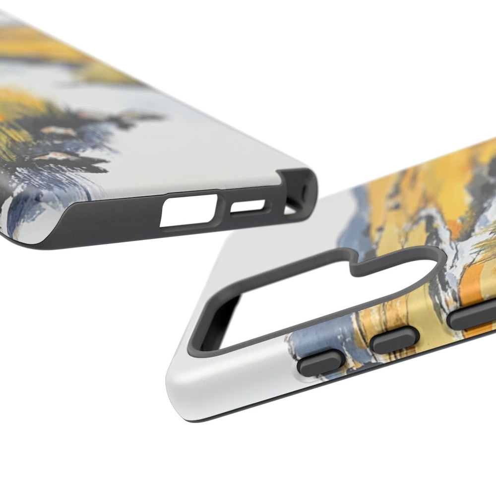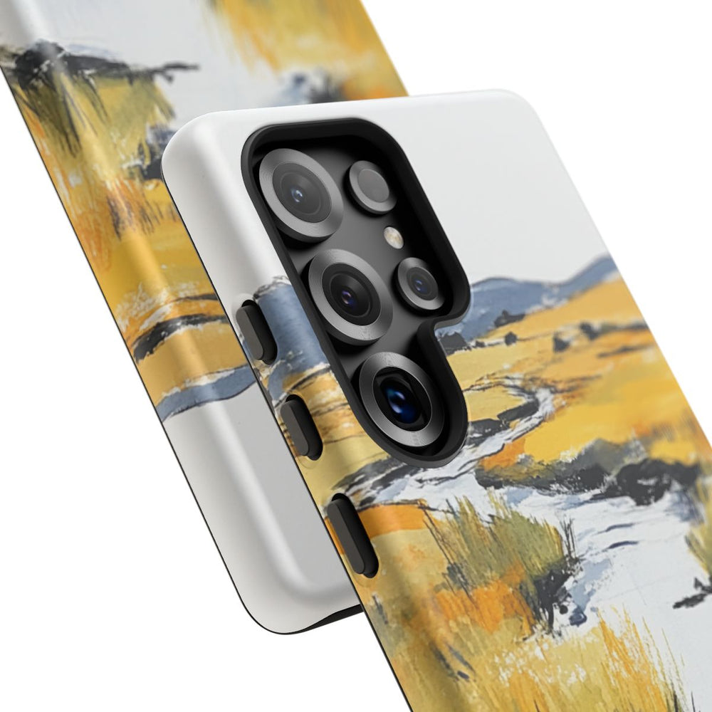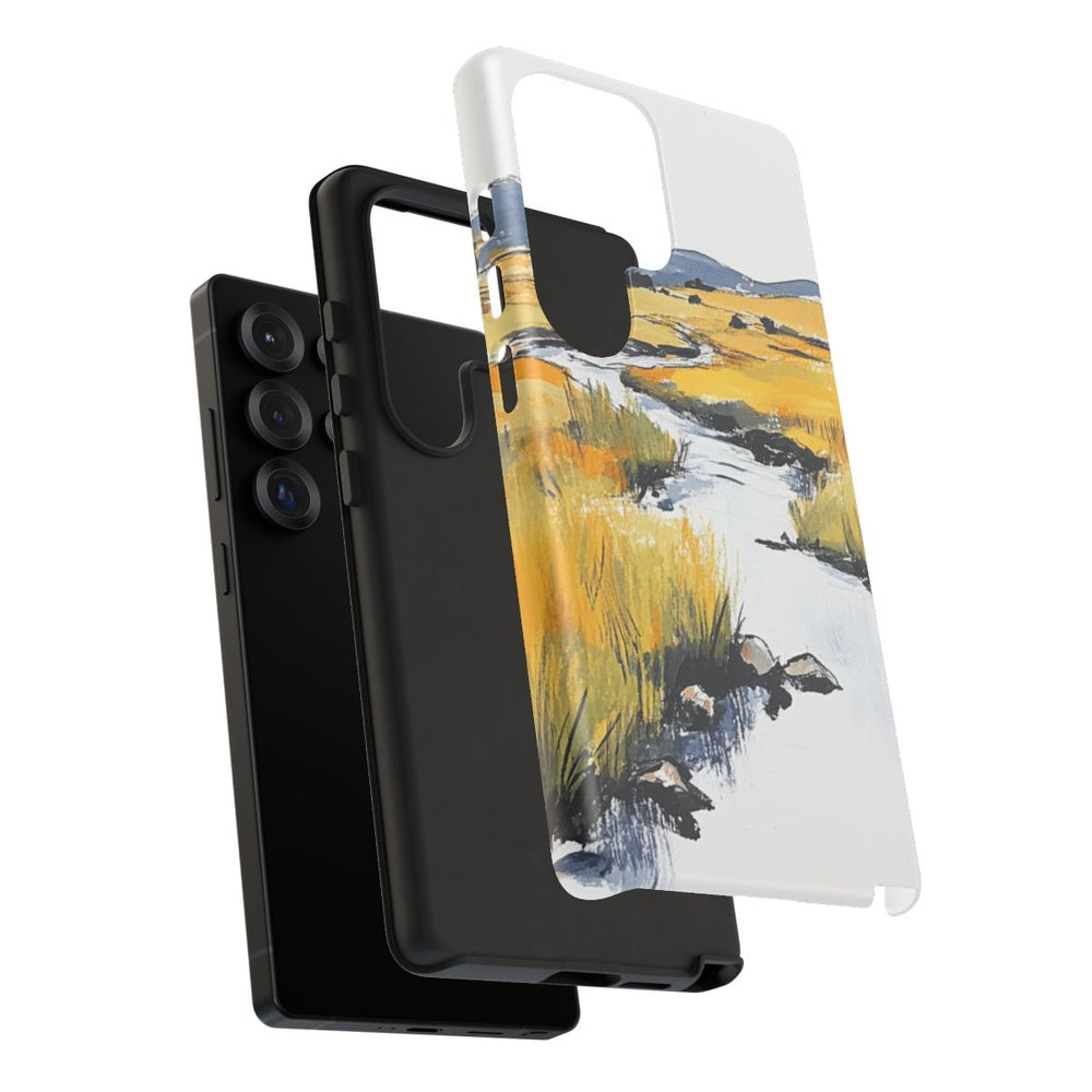 Dit hoesje is voorzien van een pasteltekening van een Brits landschap met een kronkelende beek die door velden met gele en oranje grassen stroomt. Donkere struiken en blauwe tot grijsblauwe heuvels op de achtergrond geven het tafereel extra diepte. De tekening is grof opgezet, met zachte, gedempte kleuren en weinig details op een witte achtergrond. Het hoesje bestaat uit twee lagen: een stevige polycarbonaat buitenkant en een TPU-binnenzijde. Geschikt voor draadloos opladen en bestand tegen verschillende weersomstandigheden.