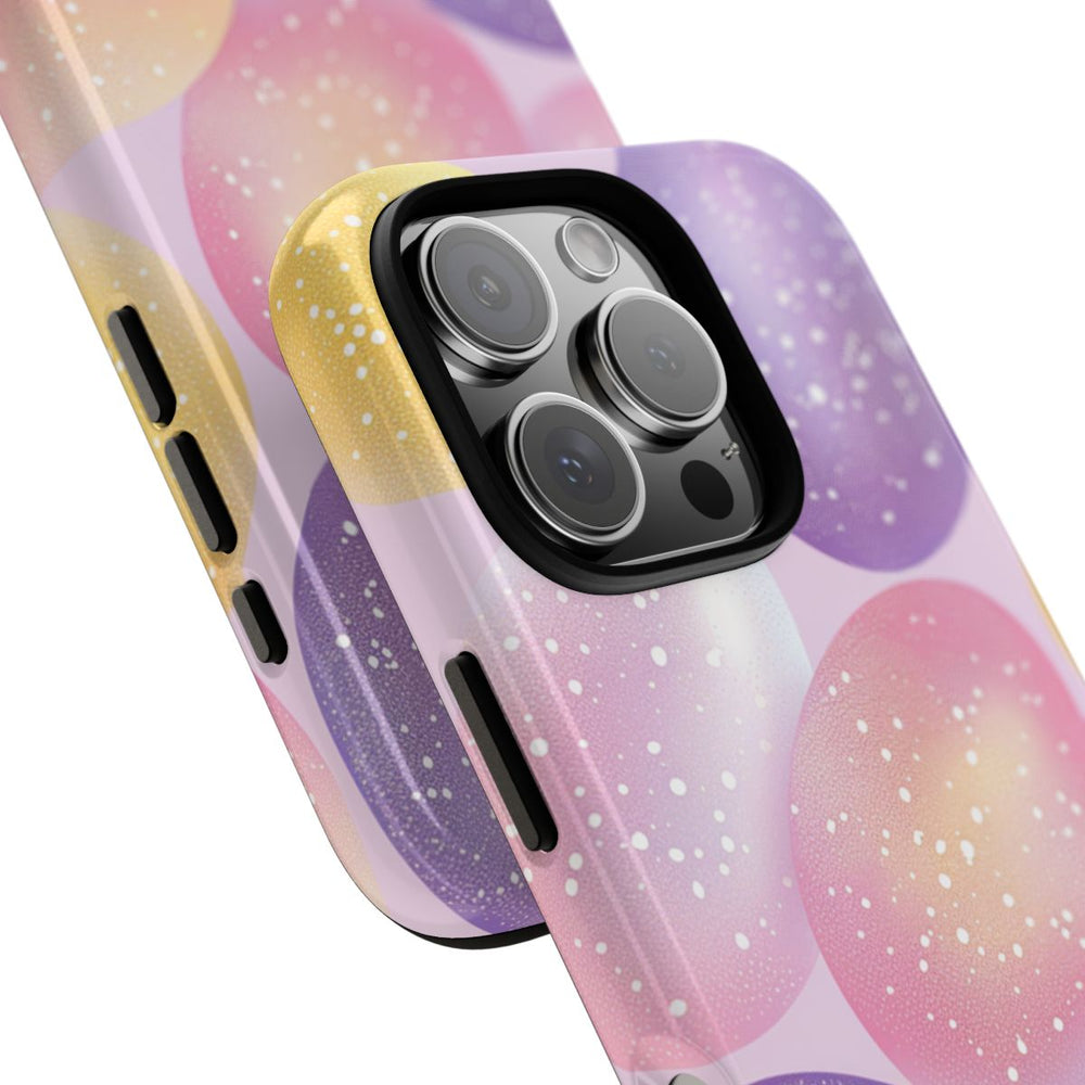 Dit telefoonhoesje heeft een naadloos patroon van glinsterende paaseieren in zachte pastelkleuren zoals paars, roze, geel en wit. Elk ei is versierd met kleine witte spikkels voor een sprankelend effect. De eieren liggen dicht bij elkaar op een zachte roze achtergrond, wat zorgt voor een feestelijke en vrolijke uitstraling. Het hoesje is glanzend en stevig, gemaakt van polycarbonaat en TPU voor dubbele bescherming. Ondersteunt draadloos opladen. De kleurrijke en opvallende uitstraling maakt dit hoesje ideaal als seizoensaccessoire.