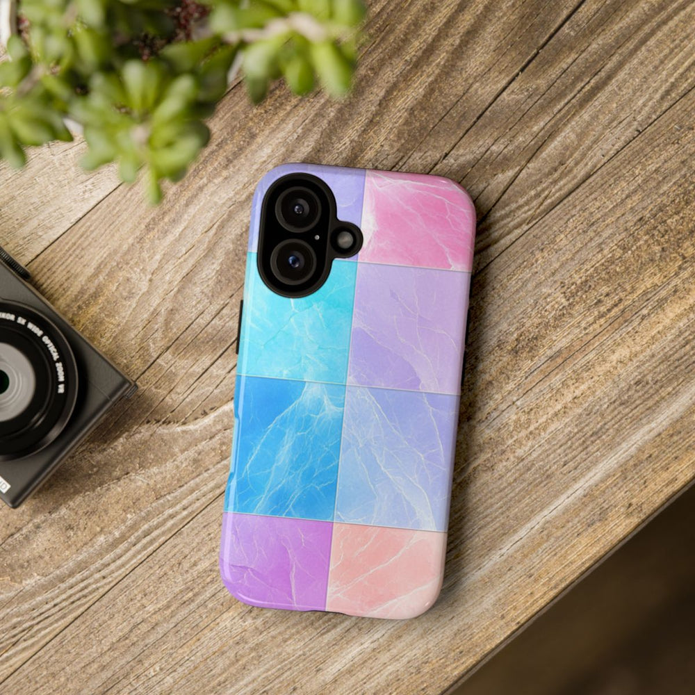 Dit telefoonhoesje heeft een patroon van vierkante tegels met een marmerstructuur in zachte pasteltinten. De tegels zijn uitgevoerd in kleuren zoals roze, paars, blauw, turquoise, groen, geel en perzik, elk voorzien van subtiele witte aders die doen denken aan natuurlijk marmer. Het geheel is netjes en gelijkmatig gerangschikt, waardoor er een fraai kleuroverloop ontstaat over het oppervlak. Het hoesje heeft een glanzende afwerking en is extra stevig dankzij de duurzame dubbele laag. Geschikt voor draadloos opladen en ideaal voor gebruik buitenshuis.