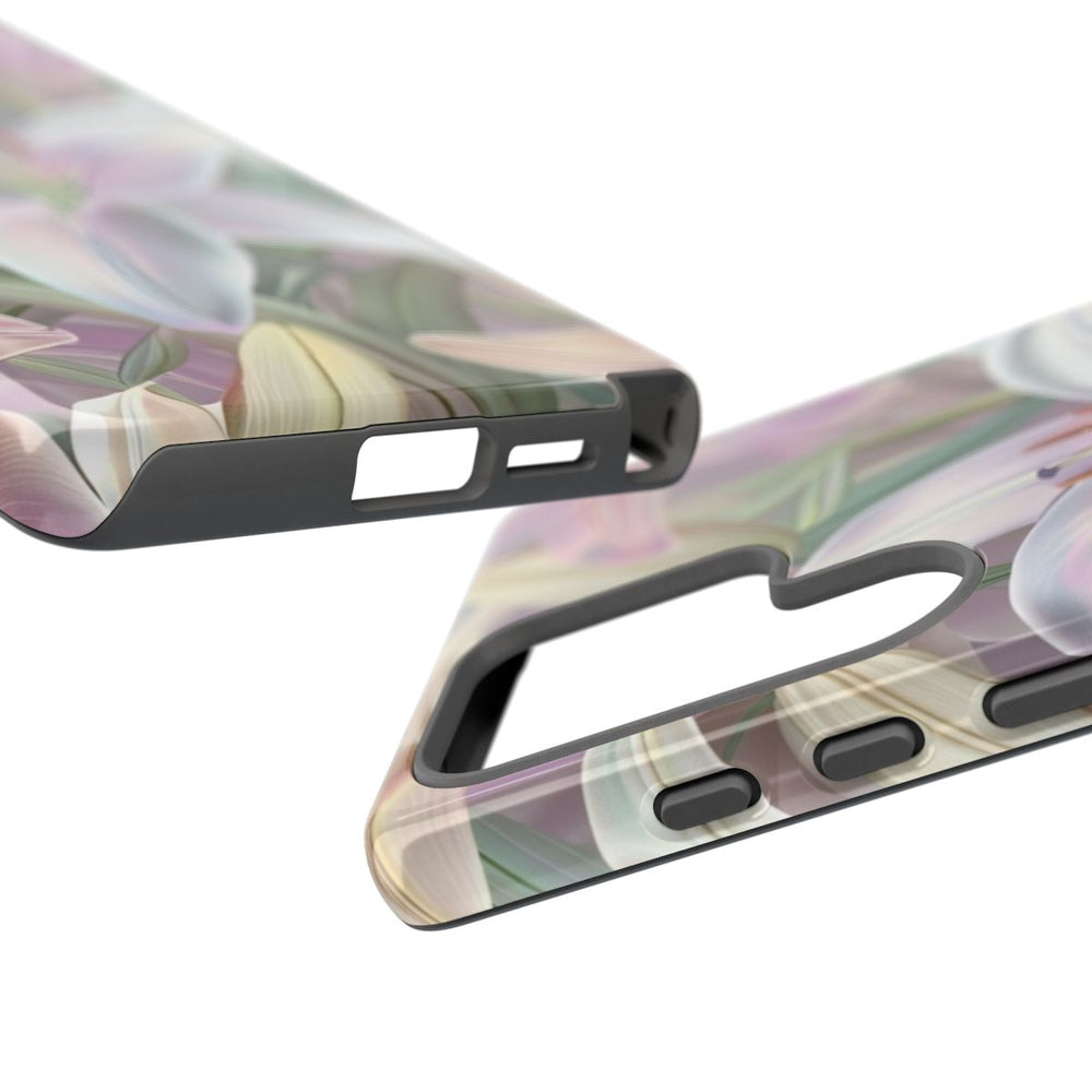 Dit hoesje is versierd met een naadloos patroon van realistische paaslelies in zachte pasteltinten zoals wit, roze, crème en lichtpaars. De bloemen zijn gedetailleerd uitgewerkt met zichtbare bloemblaadjes, meeldraden en groene bladeren, wat zorgt voor een verfijnd en elegant bloemenmotief. De achtergrond heeft een subtiele lavendelkleur die mooi aansluit bij de zachte tinten van de bloemen. Het patroon is aangebracht op een glanzend, stevig hoesje met een polycarbonaat buitenkant en een TPU-binnenzijde. Dit biedt een dubbele beschermlaag en is geschikt voor draadloos opladen.