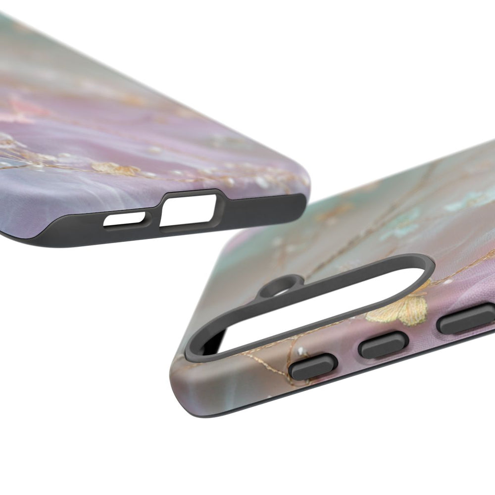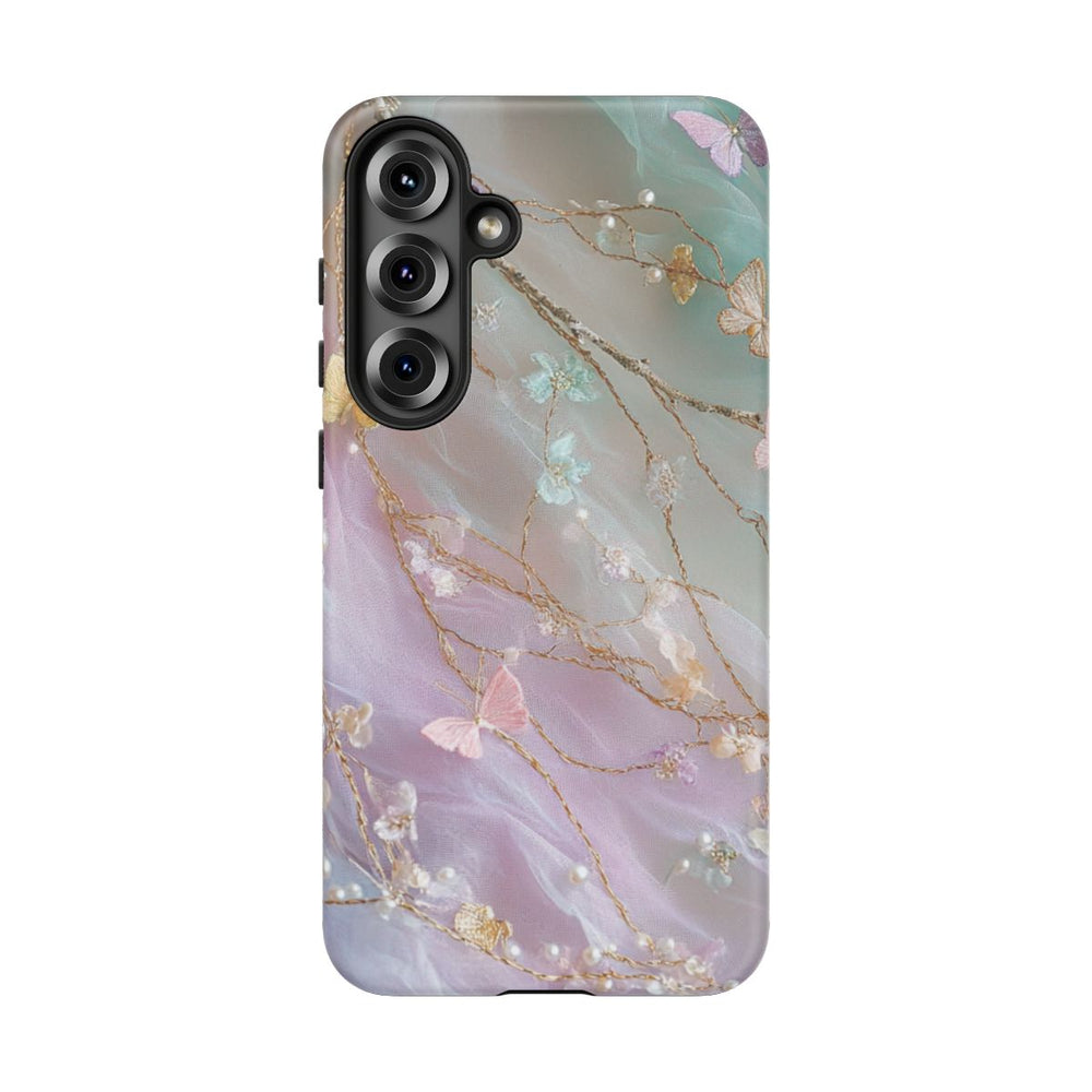 Dit hoesje heeft een ontwerp met lagen transparante stof in pasteltinten zoals lavendel, mint en zachtroze. Over de stof zijn subtiel geborduurde vlinders in zachte kleuren verspreid, samen met fijne gouden ranken die versierd zijn met kleine parelkralen en minuscule bloemetjes. Een witte berkentak met goudkleurige uiteinden geeft het geheel een natuurlijk accent. Het hoesje is voorzien van een dubbele laag voor extra stevigheid en is geschikt voor draadloos opladen.