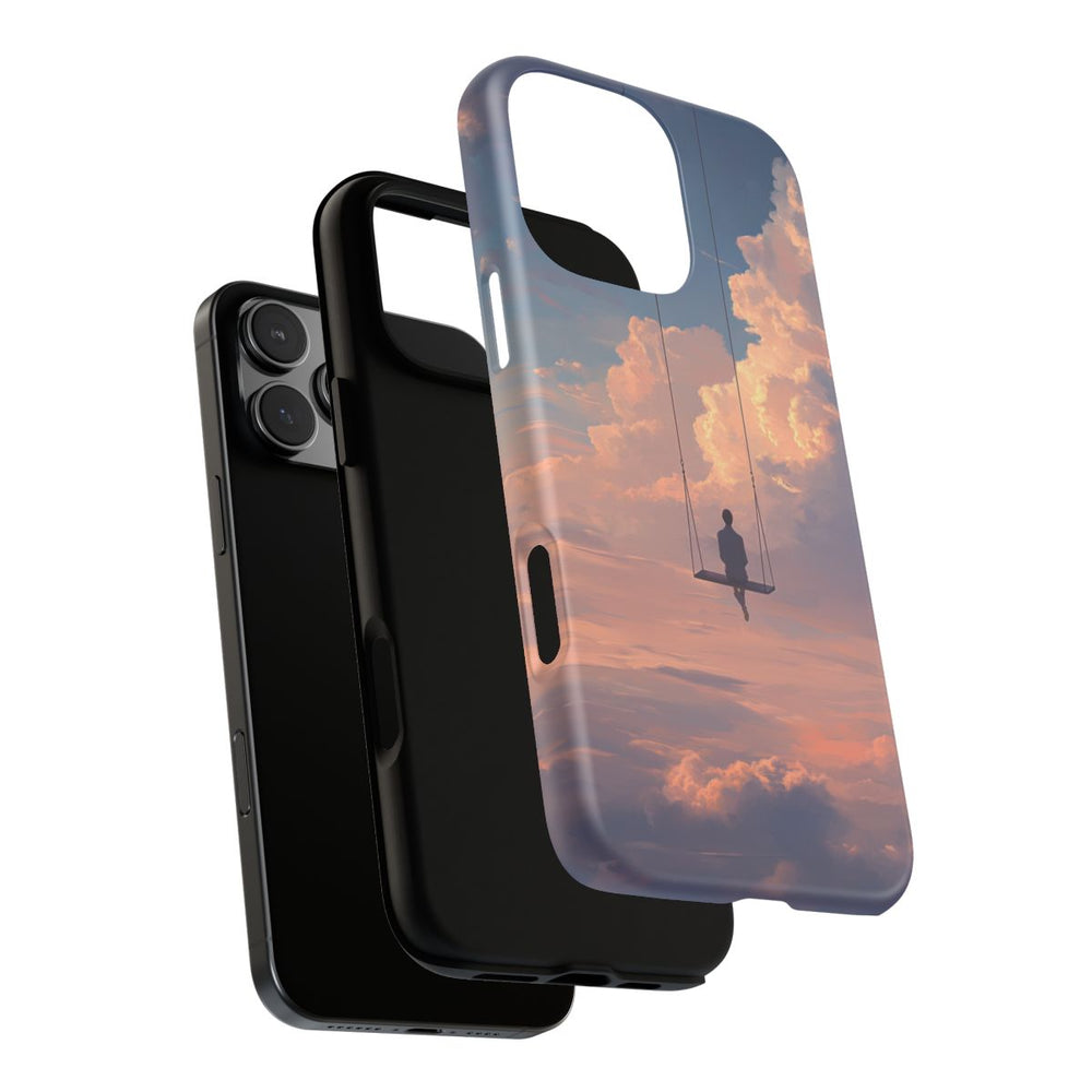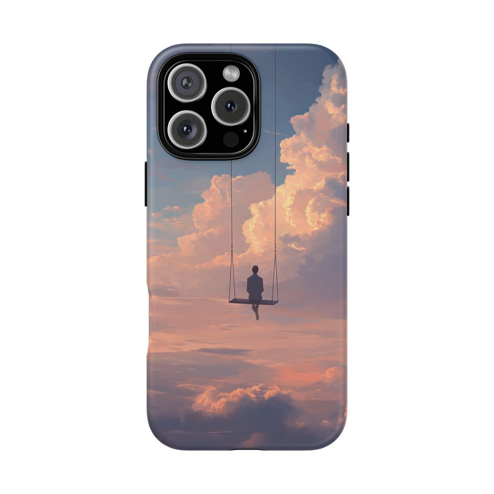 Dit ontwerp toont een persoon die hoog in de lucht op een schommel zit, omringd door grote, zachte wolken. De lucht heeft een kleurverloop van blauw naar warme perzik- en roze tinten, wat doet denken aan een rustige zonsopgang of zonsondergang. De schommel hangt aan dunne touwen en de persoon oogt kalm en in gedachten verzonken. Het hoesje bestaat uit een dubbele laag met een polycarbonaat buitenkant en een TPU-binnenzijde, ondersteunt draadloos opladen en is bestand tegen verschillende weersomstandigheden.