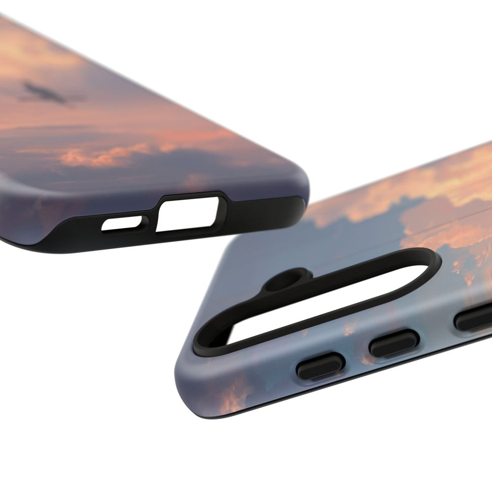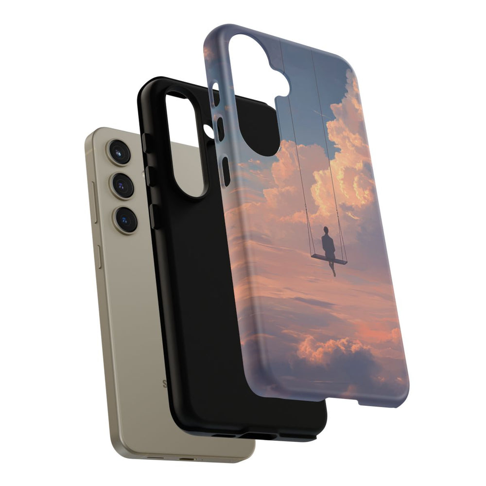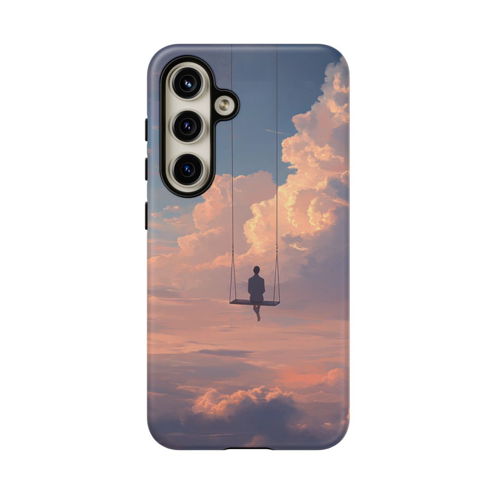 Dit hoesje toont een eenzame persoon die hoog in de lucht op een schommel zit, omgeven door zachte, uitgestrekte wolken. De lucht laat een kleurverloop zien van warme perzik- en rozetinten bij de horizon tot diepblauwe kleuren hogerop. De schommel hangt aan dunne touwen en het geheel straalt een kalme, bijna surrealistische sfeer uit. Het hoesje bestaat uit twee lagen met een matte afwerking en is gemaakt van polycarbonaat en TPU. Het is stevig, duurzaam en geschikt voor draadloos opladen.
