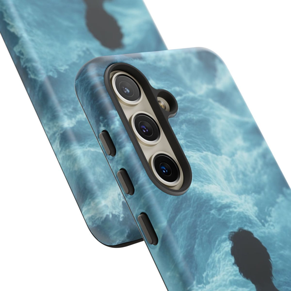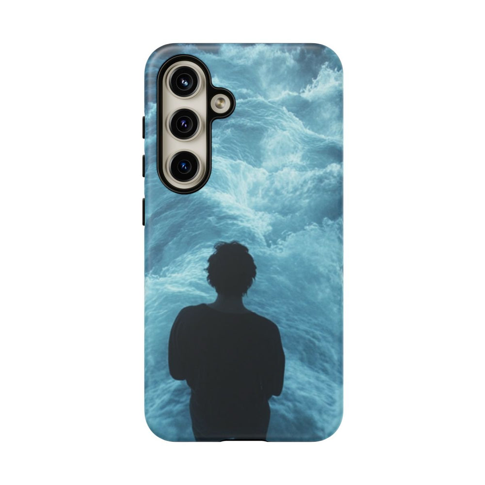 Dit hoesje toont een persoon die met de rug naar de kijker staat, omringd door golvende, dynamische blauwe watergolven. Het water oogt krachtig en levendig, wat zorgt voor een gevoel van diepte en beweging. Het hoesje heeft een dubbele laag met een matte afwerking en is gemaakt van polycarbonaat met een TPU-voering voor extra stevigheid en bescherming. Ondersteunt draadloos opladen, maar is niet geschikt voor MagSafe.