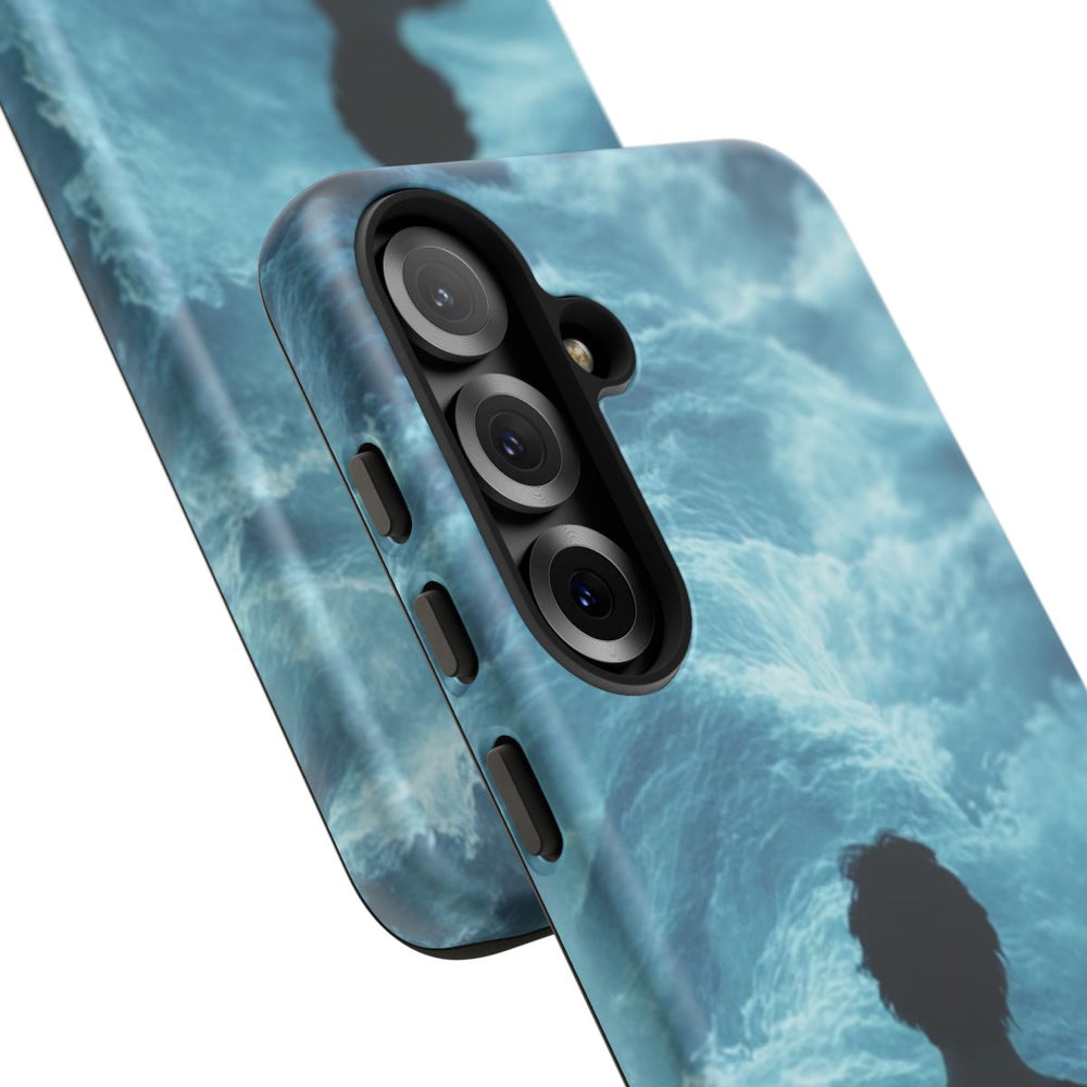 Dit telefoonhoesje toont een persoon met de rug naar de kijker, omringd door kolkende, levendige watergolven in verlichte tinten blauw en wit. Het water oogt onstuimig en geeft een gevoel van beweging en diepte. Het matte, stevige hoesje heeft een buitenkant van polycarbonaat en een binnenkant van TPU voor extra stevigheid en bescherming. Ondersteunt draadloos opladen, maar is niet geschikt voor MagSafe.