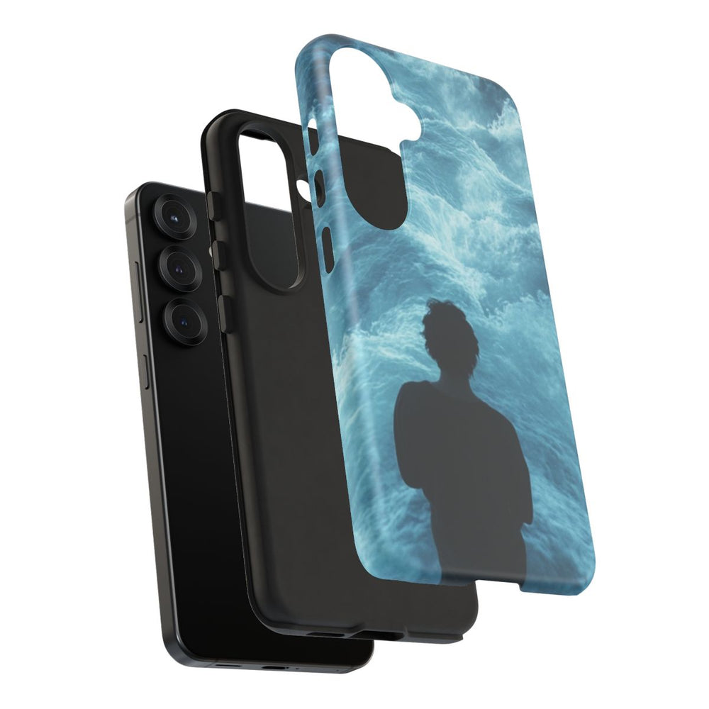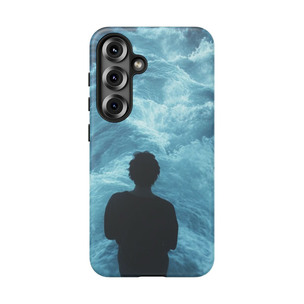 Dit hoesje toont een persoon die met de rug naar de kijker staat en uitkijkt over een dynamisch tafereel van golvende waterstromen in verschillende tinten blauw en wit. Het water oogt onstuimig en levendig, wat een gevoel van beweging en diepte geeft. Dit stevige hoesje bestaat uit twee lagen: een matte polycarbonaat buitenkant en een TPU-binnenzijde voor extra stevigheid en bescherming. Geschikt voor draadloos opladen. Niet geschikt voor MagSafe.
