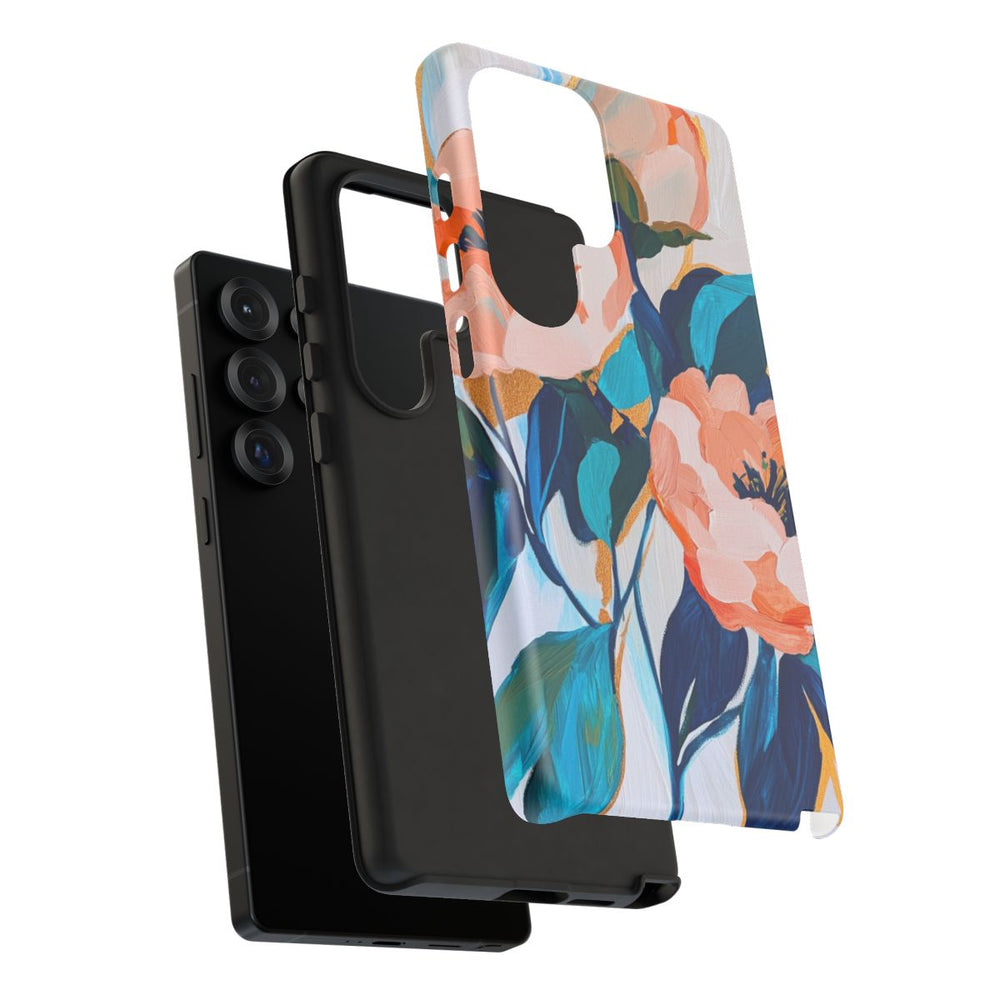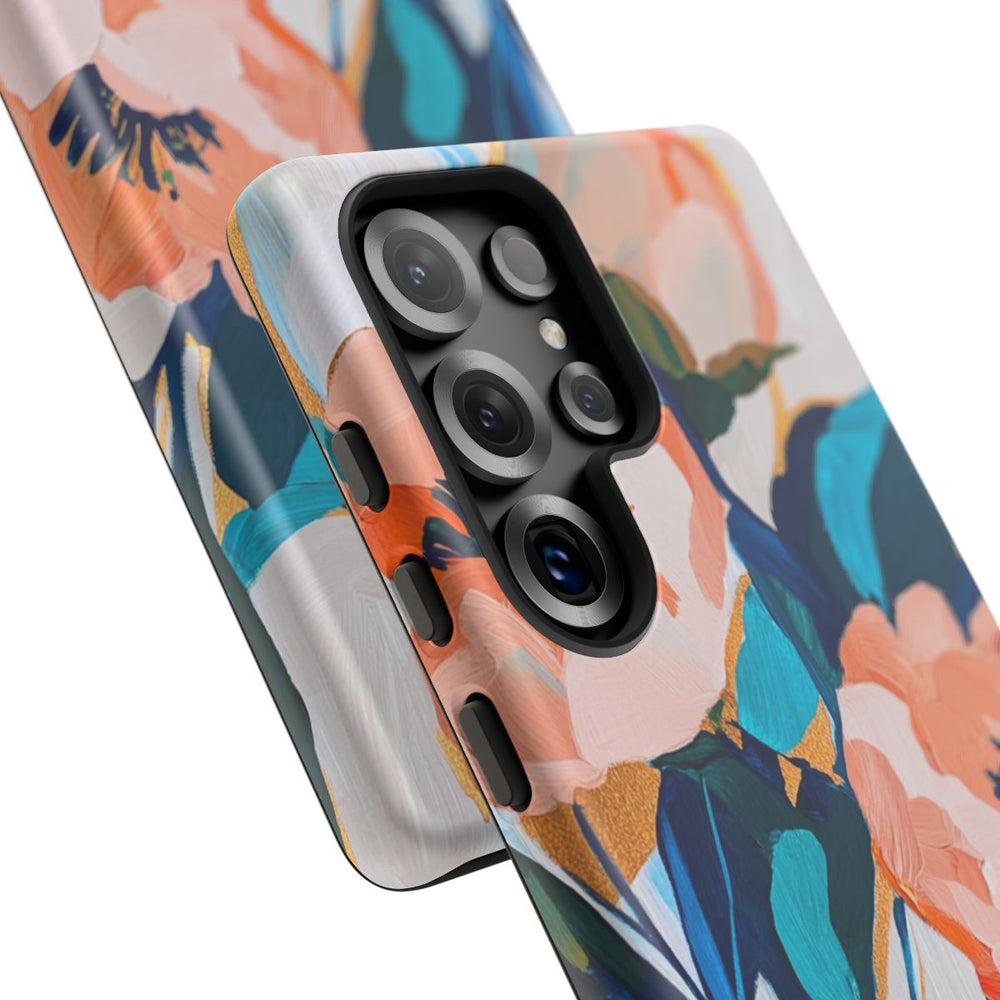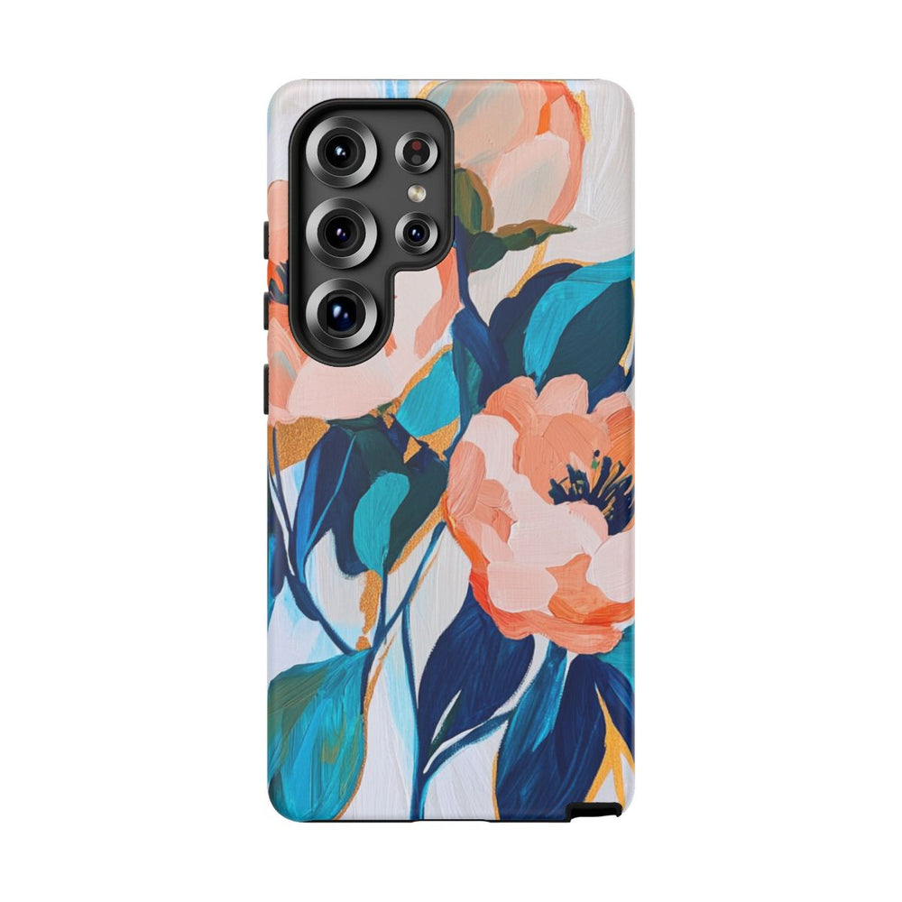 Dit ontwerp toont een close-up van drie grote pioenrozen met zachte perzik- en koraalkleurige bloemblaadjes. De bloemen worden omringd door opvallende donkerblauwe en turquoise bladeren. De lichte achtergrond is voorzien van subtiele witte en lichtblauwe penseelstreken, met verfijnde gouden lijnen die het geheel een elegante uitstraling geven. De afbeelding is gedrukt op een matte, stevige telefoonhoesje met dubbele laag, speciaal ontworpen voor een ultra smartphone model.
