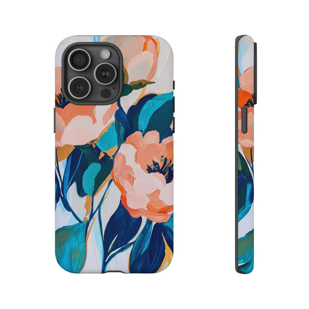 Dit ontwerp toont een bloemenschildering met grote pioenrozen in perzik- en koraaltinten. De bladeren zijn geschilderd in diepblauwe en turquoise kleuren en verfijnd afgewerkt met subtiele gouden lijnen. De achtergrond is zacht wit met een lichte structuur. Het hoesje bestaat uit twee stevige lagen van polycarbonaat en TPU, wat zorgt voor extra bescherming en geschikt is voor draadloos opladen.