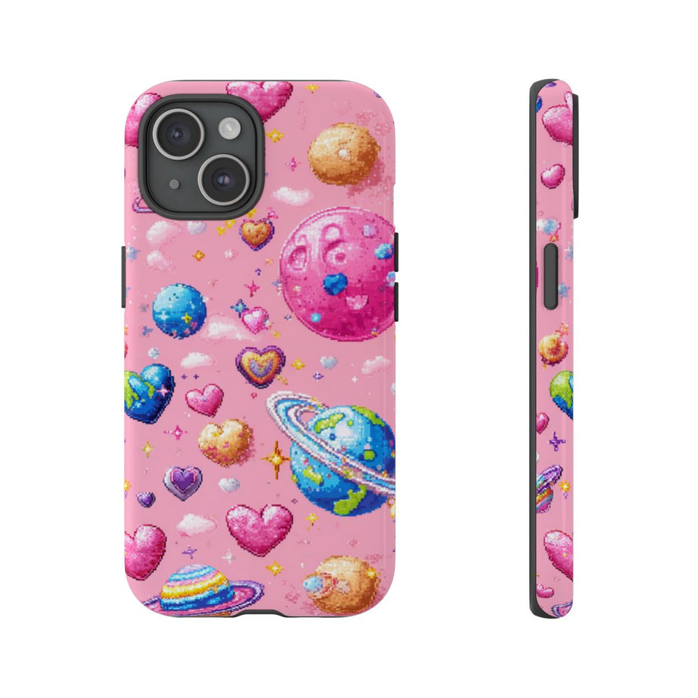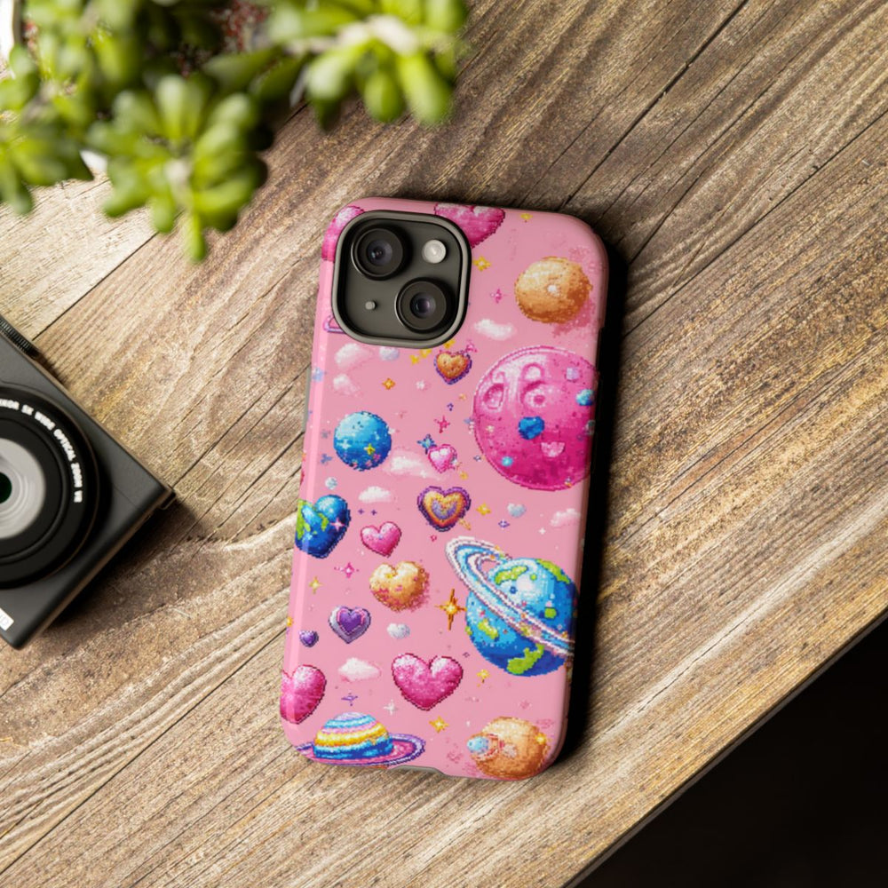 Dit telefoonhoesje heeft een naadloos patroon van pixel art planeten en harten op een roze achtergrond. De planeten zijn uitgevoerd in verschillende kleuren, zoals blauw, paars en goud, en sommige hebben ringen. Roze harten in diverse formaten zijn verspreid over het ontwerp, samen met kleine sterretjes en wolkjes. De pixelstijl zorgt voor een retro videogame-uitstraling. Het hoesje is glanzend en stevig, met een buitenkant van polycarbonaat en een binnenzijde van TPU. Dit biedt een dubbele beschermlaag en ondersteunt draadloos opladen.