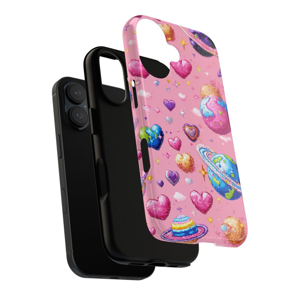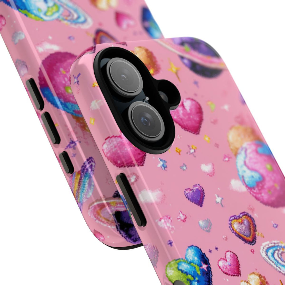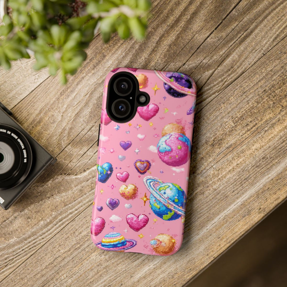 Dit hoesje heeft een doorlopend patroon van pixel art planeten en harten op een roze achtergrond. De planeten zijn kleurrijk, voorzien van ringen en verschillende texturen, terwijl de harten in diverse groottes en tinten roze, paars en goud voorkomen. Kleine glinsteringen en sterretjes zorgen voor een speelse uitstraling. Het ontwerp heeft de uitstraling van een retro videogame met verfijnde pixel-schaduwen. Het hoesje bestaat uit twee lagen van polycarbonaat en TPU, biedt extra bescherming en ondersteunt draadloos opladen.