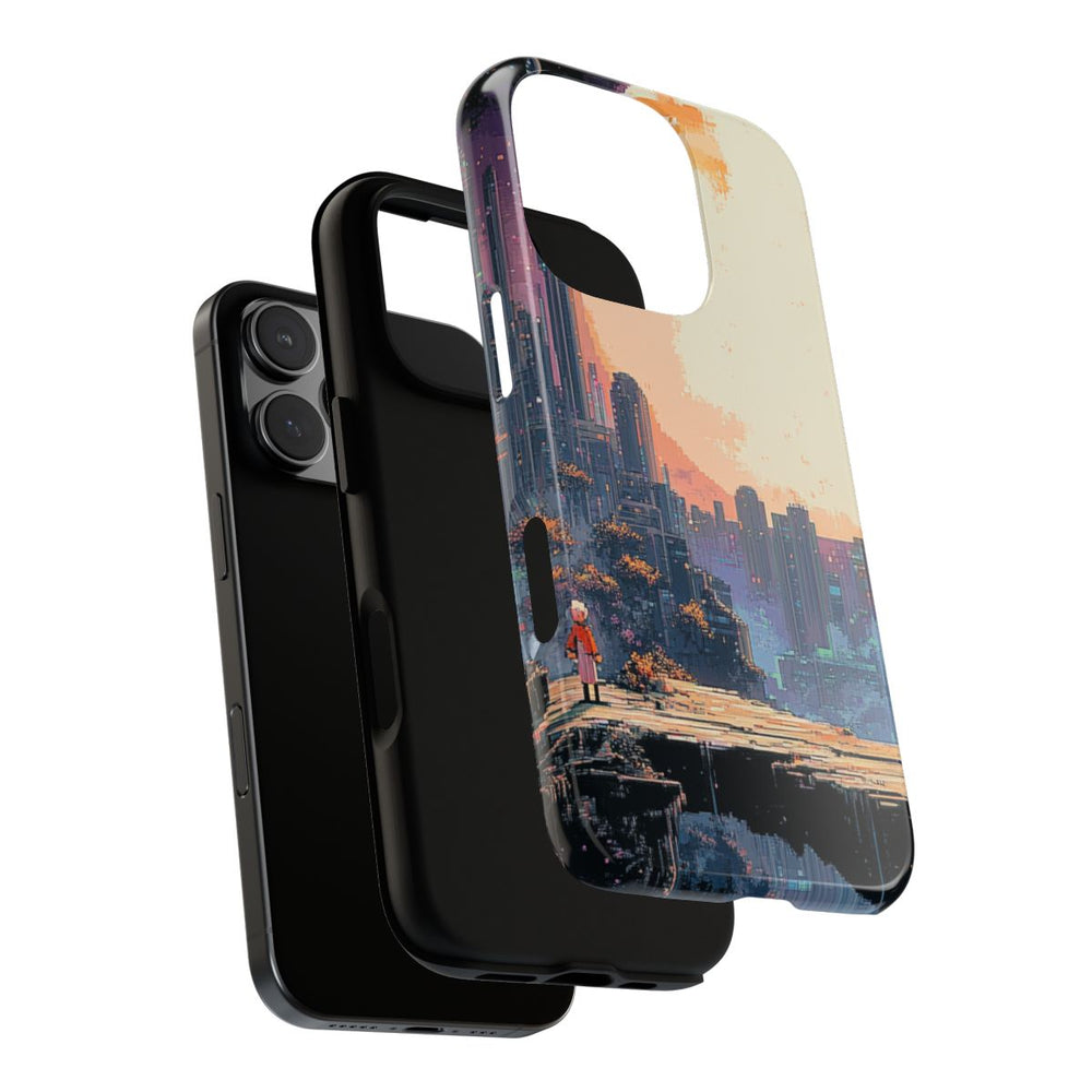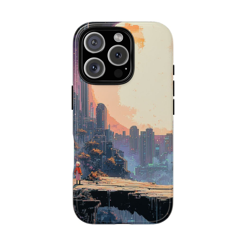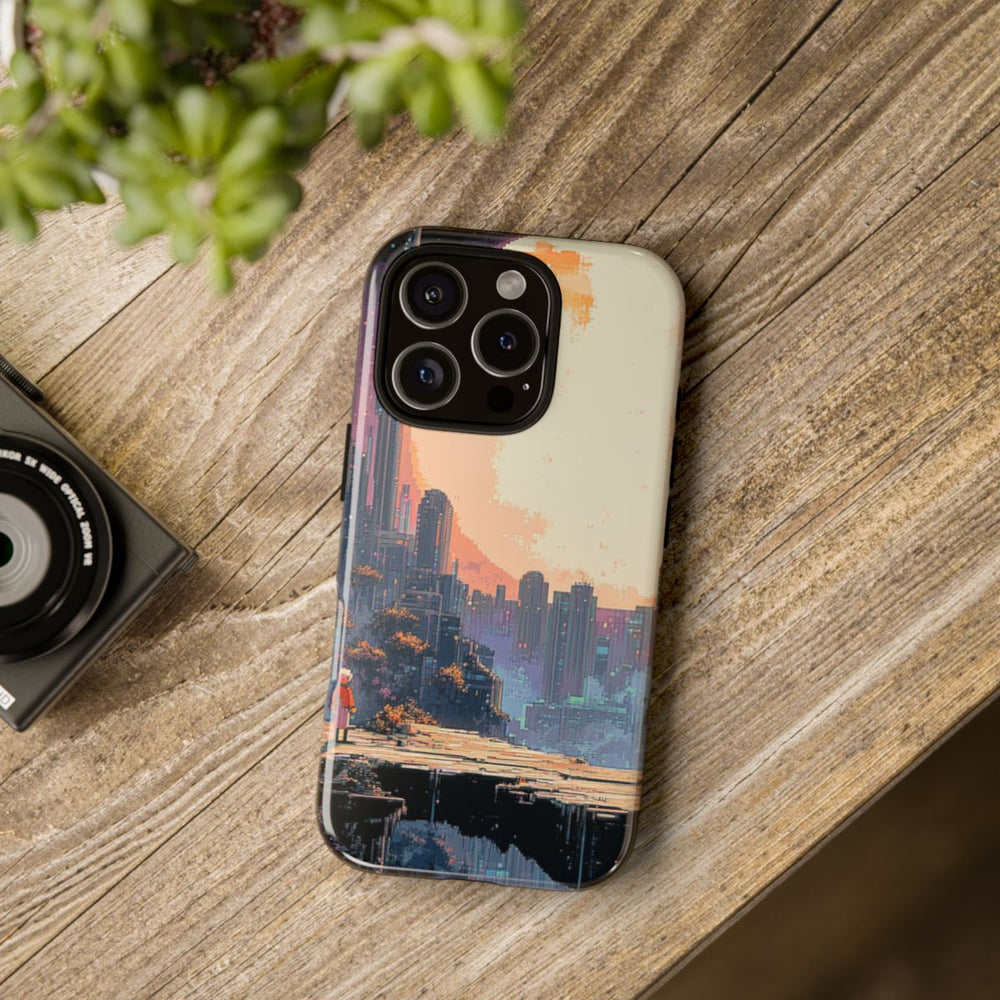 Dit telefoonhoesje heeft een pixel art ontwerp van een stadsgezicht met hoge, futuristische gebouwen onder een grote, lichtgevende maan. Op de voorgrond staat een klein figuurtje op een rotsachtige rand, omringd door bomen met oranje bladeren. De donkere nachtelijke hemel is bezaaid met sterren en zorgt voor een sfeervolle uitstraling. Het hoesje is glanzend afgewerkt en bestaat uit een stevige dubbele laag van polycarbonaat en TPU, waardoor het extra duurzaam is en goed bestand tegen buitengebruik. Ondersteunt draadloos opladen.