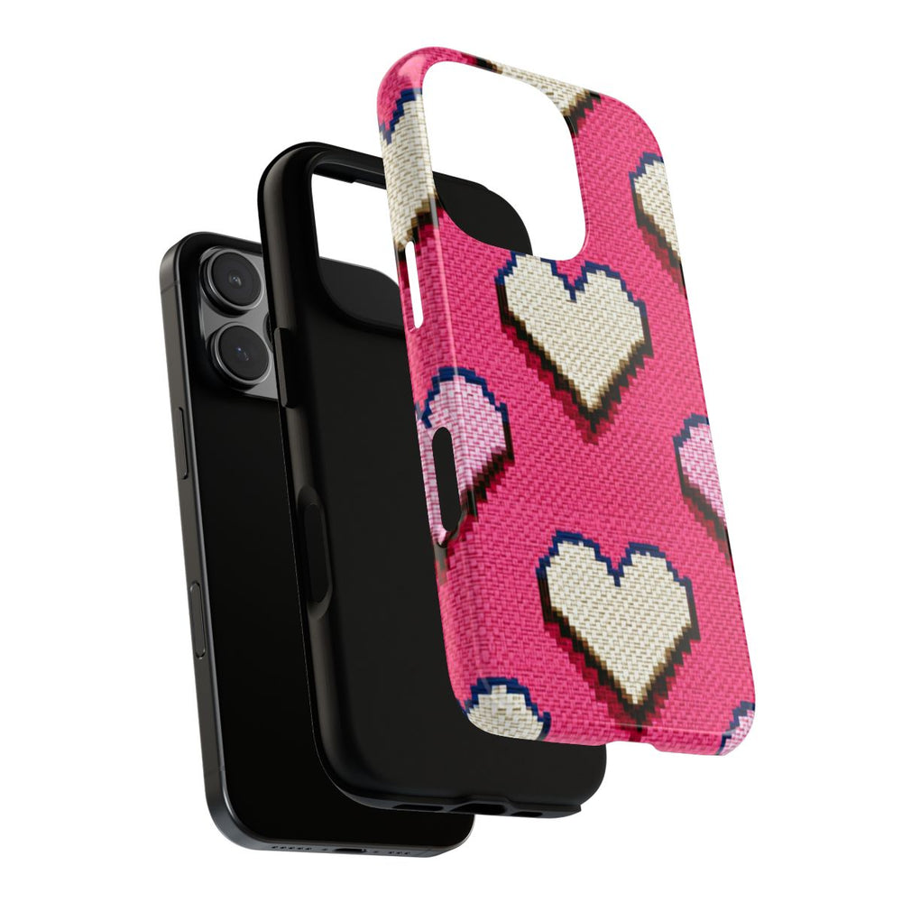 Dit hoesje is bedrukt met een doorlopend patroon van pixelachtige hartjes in witte en lichtroze tinten op een helderroze achtergrond. Elk hartje heeft een blokkerige 8-bit stijl met een subtiel schaduweffect, wat zorgt voor een retro digitale uitstraling. De textuur doet denken aan geweven of geborduurde stof, waardoor het patroon diepte en een tastbaar karakter krijgt. Het hoesje heeft een glanzende afwerking en bestaat uit twee lagen voor extra stevigheid en bescherming, en ondersteunt draadloos opladen.