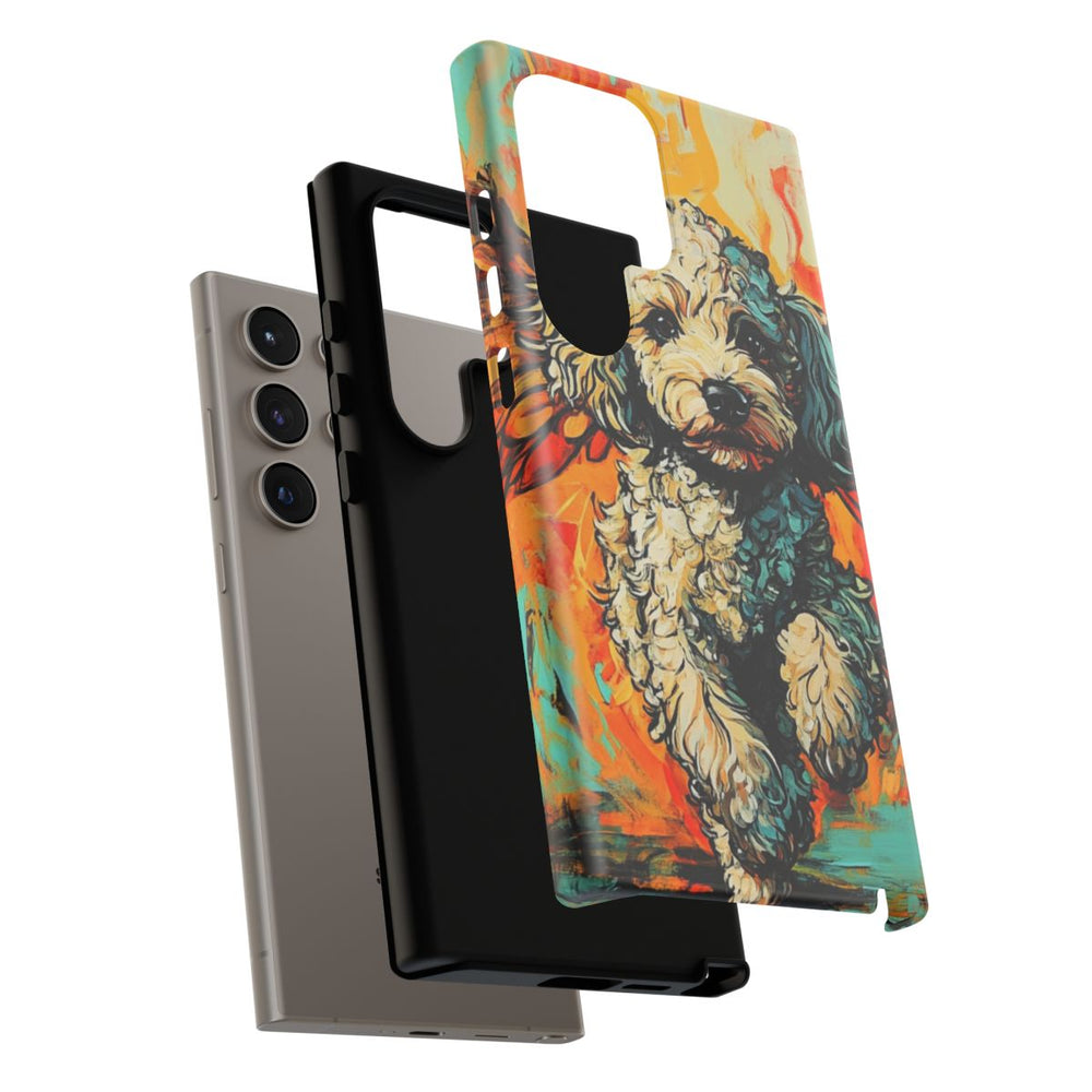 Dit opvallende hoesje toont een pluizige poedel met vurige vleugels tegen een kleurrijke achtergrond in oranje en teal. Het ontwerp straalt speelsheid uit door de levendige penseelstreken en dynamische compositie. Het hoesje sluit perfect aan om je toestel, biedt goede bescherming en laat deze unieke en in het oog springende afbeelding mooi uitkomen. Gemaakt van stevige materialen en geschikt voor draadloos opladen, zodat je altijd gemakkelijk je telefoon kunt gebruiken.