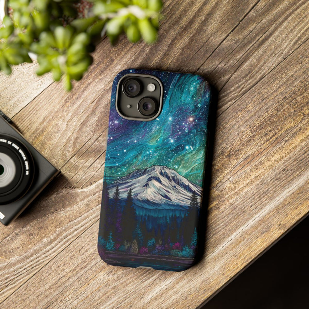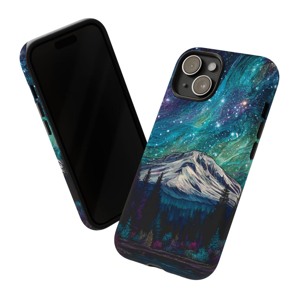 Dit hoesje toont een indrukwekkende, met sneeuw bedekte berg, omringd door donkere dennen en kleurrijke struiken. Boven de berg strekt zich een wervelende, levendige nachtelijke hemel uit, vol sterren en verfijnde patronen, wat zorgt voor een magische en psychedelische sfeer. Diepe tinten blauw, paars en groen overheersen het ontwerp. De afbeelding is rijk aan details en heeft een duidelijke penseelstructuur, waardoor het hoesje een opvallende en duurzame matte uitstraling krijgt.