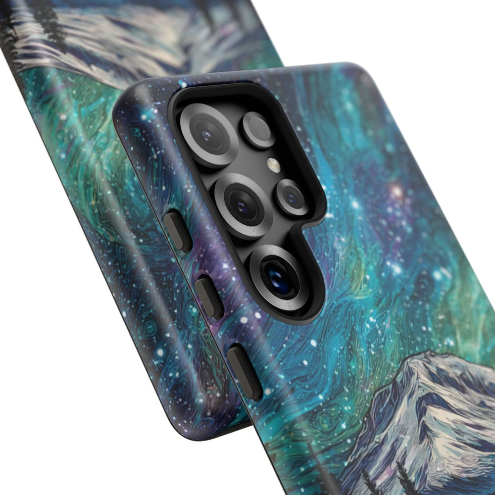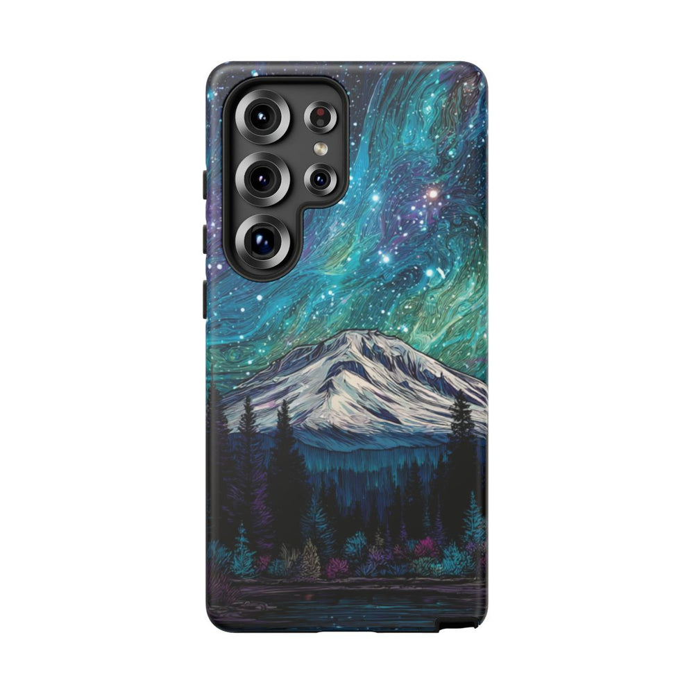 Dit hoesje toont een indrukwekkende, met sneeuw bedekte berg, omringd door donkere dennen en kleurrijke struiken. Boven de berg strekt zich een wervelende, levendige nachtelijke hemel uit, vol sterren en verfijnde patronen, wat zorgt voor een magische en psychedelische sfeer. Diepe tinten blauw, paars en groen overheersen het ontwerp. De afbeelding is rijk aan details en heeft een duidelijke penseelstructuur, waardoor het hoesje een opvallende en duurzame matte uitstraling krijgt.