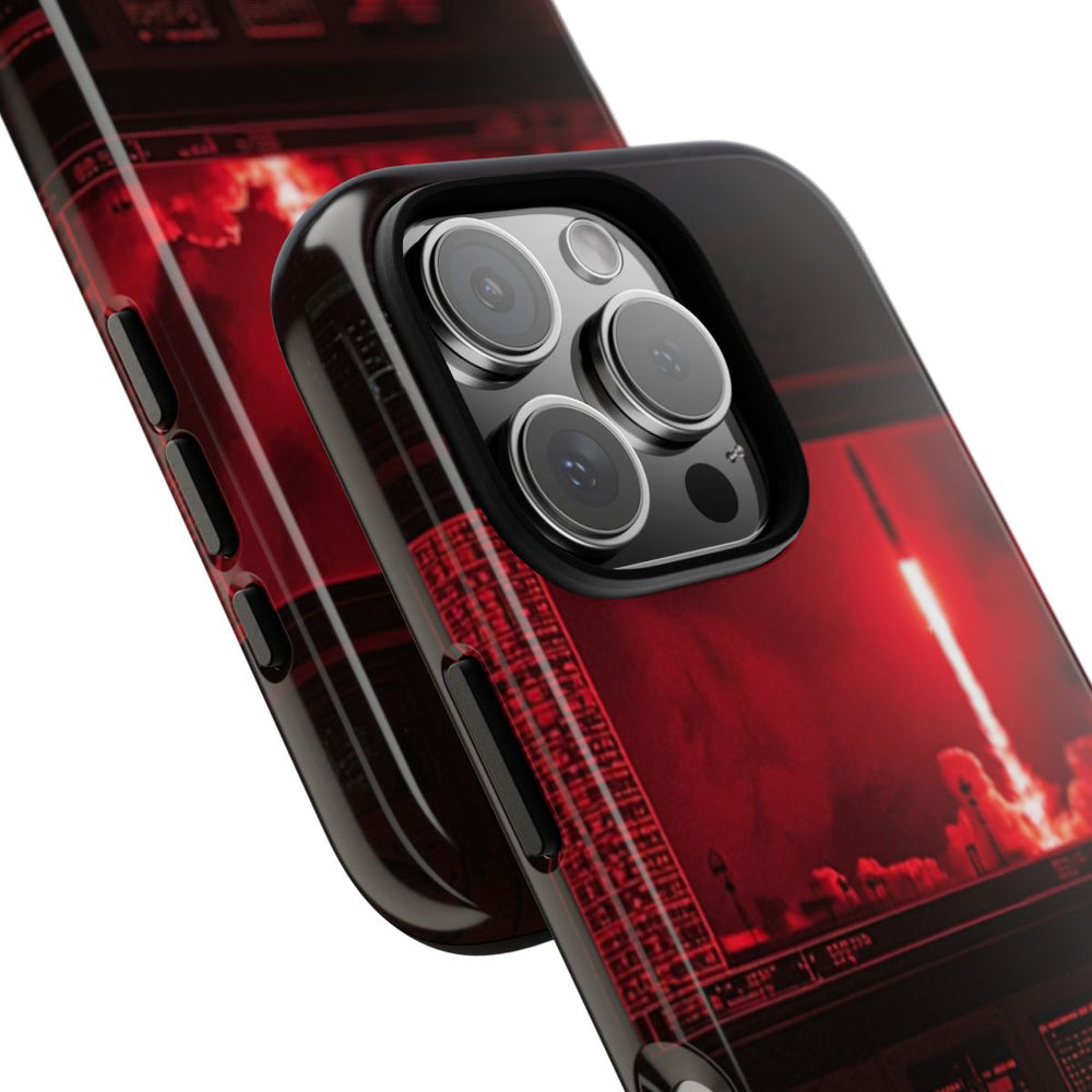Deze afbeelding toont het interieur van een controlekamer, waar twee silhouetten zitten voor meerdere verlichte panelen en schermen. Op het centrale scherm is een raket te zien die opstijgt, omringd door heldere vlammen en rook. De hele scène is gehuld in diep rood licht, wat de technische en intense sfeer benadrukt. Dit glanzende en stevige hoesje is gemaakt van polycarbonaat met een TPU-voering, ontworpen voor duurzaamheid en geschikt voor draadloos opladen.