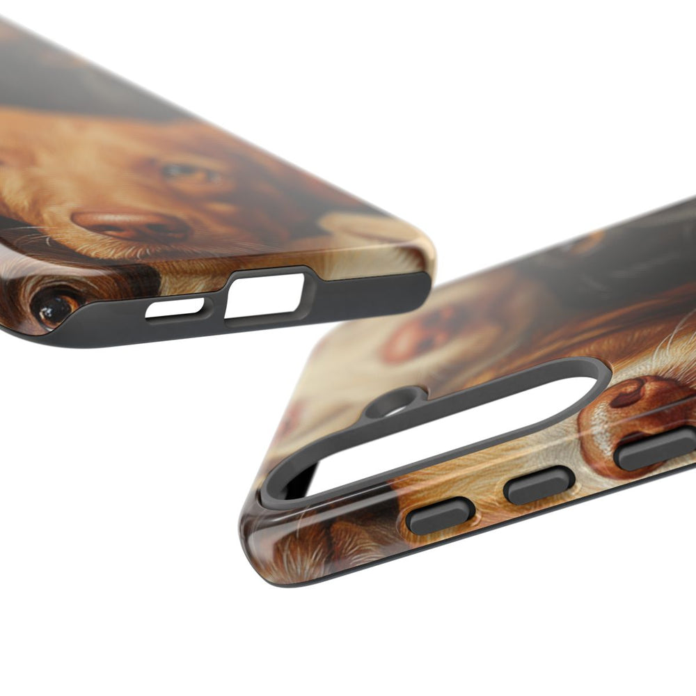 Dit ontwerp toont een patroon van realistische hondenkoppen die dicht tegen elkaar zijn geplaatst, zonder zichtbare achtergrond. De honden hebben verschillende vachtkleuren, zoals zwart, wit, goud, bruin en gestroomd. Elke hond heeft sprekende, ronde ogen en een gedetailleerde vachtstructuur, wat zorgt voor een levensechte en charmante uitstraling. De afbeelding is gedrukt op een glanzend, stevig hoesje van polycarbonaat en TPU, dat bestaat uit twee lagen voor extra bescherming en geschikt is voor draadloos opladen. De uitstraling van het hoesje is warm en schattig.