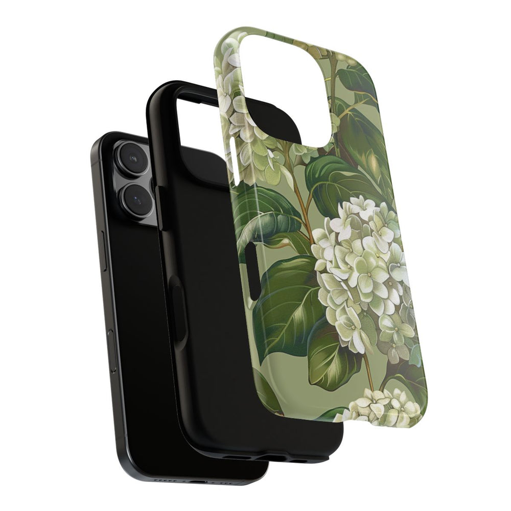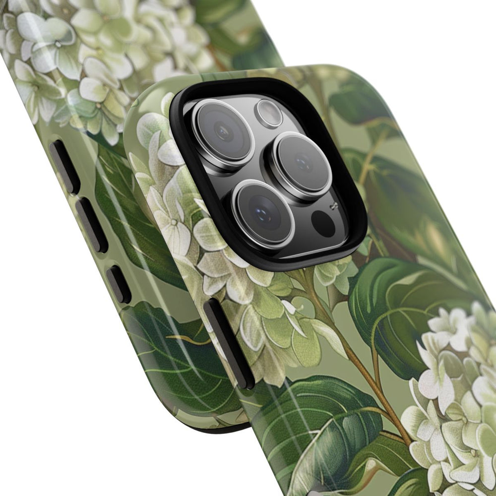 Dit ontwerp toont een naadloos patroon van realistische witte hortensiabloemen met gedetailleerde bloemblaadjes en weelderige groene bladeren. De achtergrond heeft een zachte groentint die mooi aansluit bij de natuurlijke kleuren van de bloemen en het blad. Het patroon is dicht en gelijkmatig verdeeld, wat zorgt voor een harmonieuze en elegante botanische uitstraling. Het hoesje is glanzend en stevig dankzij de dubbele laag, biedt optimale bescherming en is geschikt voor draadloos opladen.