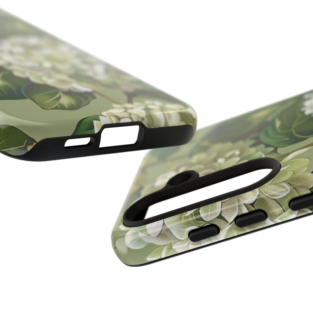 Dit ontwerp toont een naadloos patroon van realistische witte hortensiabloemen met gedetailleerde bloemblaadjes en weelderige groene bladeren. De achtergrond heeft een zachte groentint die mooi aansluit bij de natuurlijke kleuren van de bloemen en het blad. Het patroon is dicht en gelijkmatig verdeeld, wat zorgt voor een harmonieuze en elegante botanische uitstraling. Het hoesje is glanzend en stevig dankzij de dubbele laag, biedt optimale bescherming en is geschikt voor draadloos opladen.