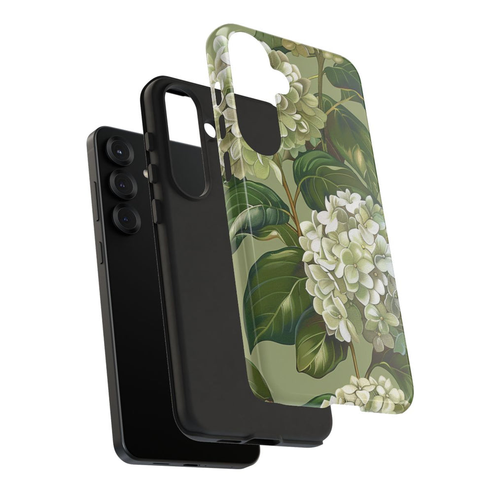Dit ontwerp toont een naadloos patroon van realistische witte hortensiabloemen met gedetailleerde bloemblaadjes en weelderige groene bladeren. De achtergrond heeft een zachte groentint die mooi aansluit bij de natuurlijke kleuren van de bloemen en het blad. Het patroon is dicht en gelijkmatig verdeeld, wat zorgt voor een harmonieuze en elegante botanische uitstraling. Het hoesje is glanzend en stevig dankzij de dubbele laag, biedt optimale bescherming en is geschikt voor draadloos opladen.