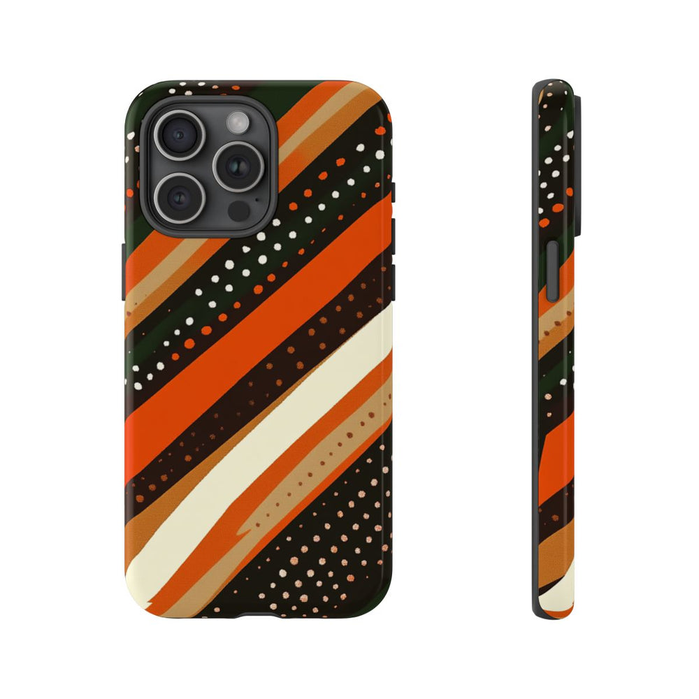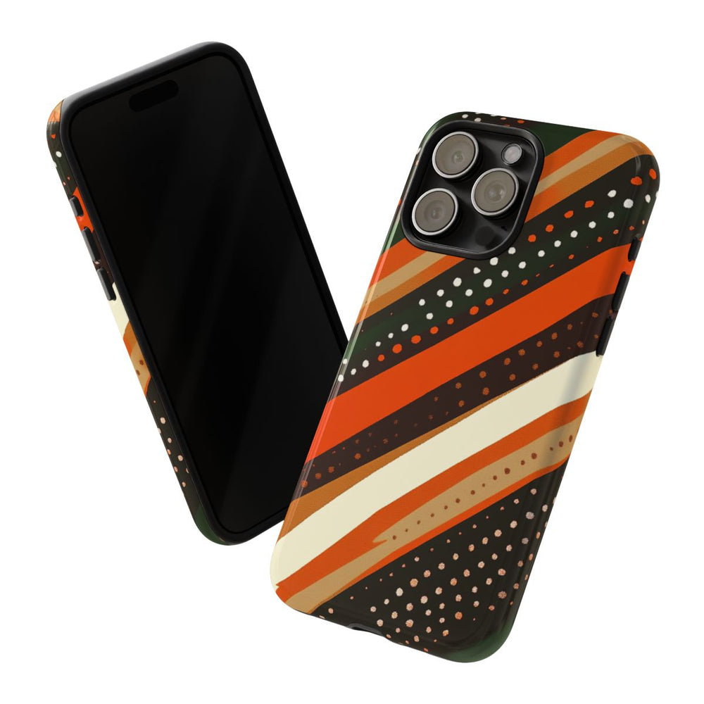 Dit hoesje heeft een opvallend ontwerp met diagonale strepen in warme aardetinten zoals gebrand oranje, donkerbruin, bosgroen, beige en crème. De strepen verschillen in breedte en zijn versierd met kleine stippen in wit en oranje, wat zorgt voor een levendige, vintage uitstraling. Het patroon ademt een retro sfeer uit de jaren 70, gecombineerd met een eigentijdse twist. Het hoesje is uitgevoerd in een glanzende, stevige uitvoering met een buitenkant van polycarbonaat en een TPU-binnenzijde. Zo biedt het hoesje optimale bescherming dankzij de dubbele laag en is het geschikt voor draadloos opladen.
