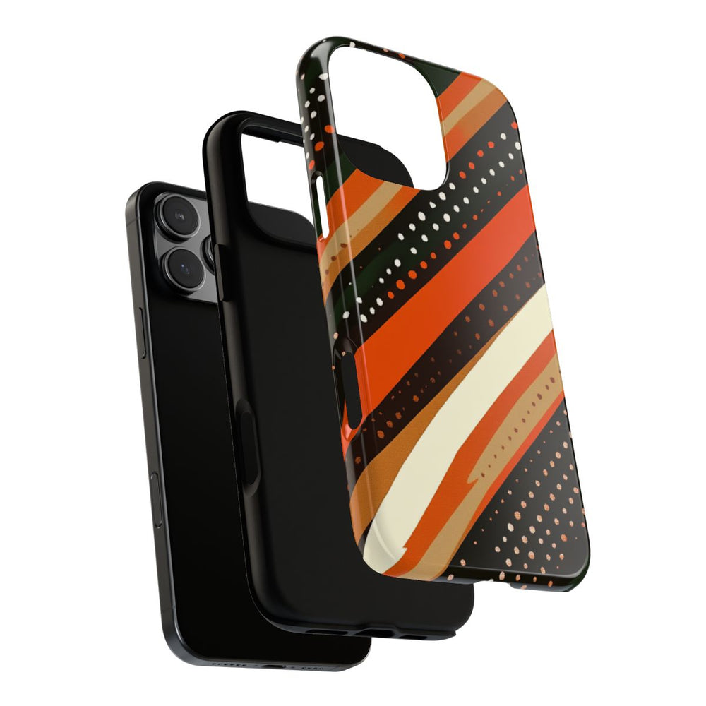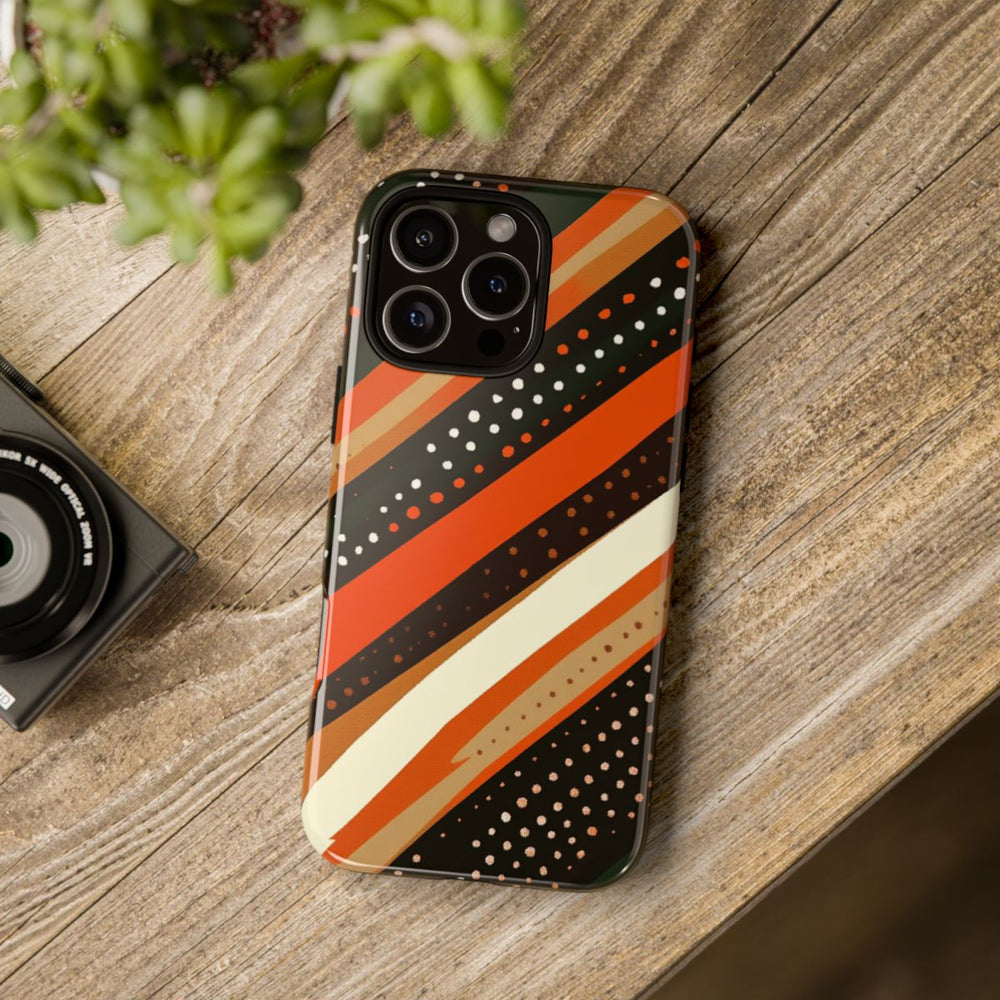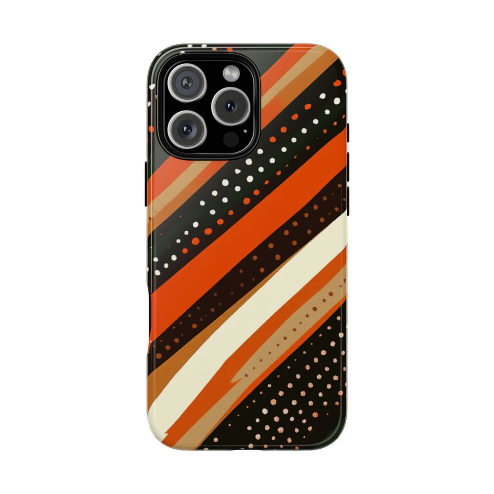 Dit hoesje heeft een opvallend ontwerp met diagonale strepen in warme aardetinten zoals gebrand oranje, donkerbruin, bosgroen, beige en crème. De strepen verschillen in breedte en zijn versierd met kleine stippen in wit en oranje, wat zorgt voor een levendige, vintage uitstraling. Het patroon ademt een retro sfeer uit de jaren 70, gecombineerd met een eigentijdse twist. Het hoesje is uitgevoerd in een glanzende, stevige uitvoering met een buitenkant van polycarbonaat en een TPU-binnenzijde. Zo biedt het hoesje optimale bescherming dankzij de dubbele laag en is het geschikt voor draadloos opladen.