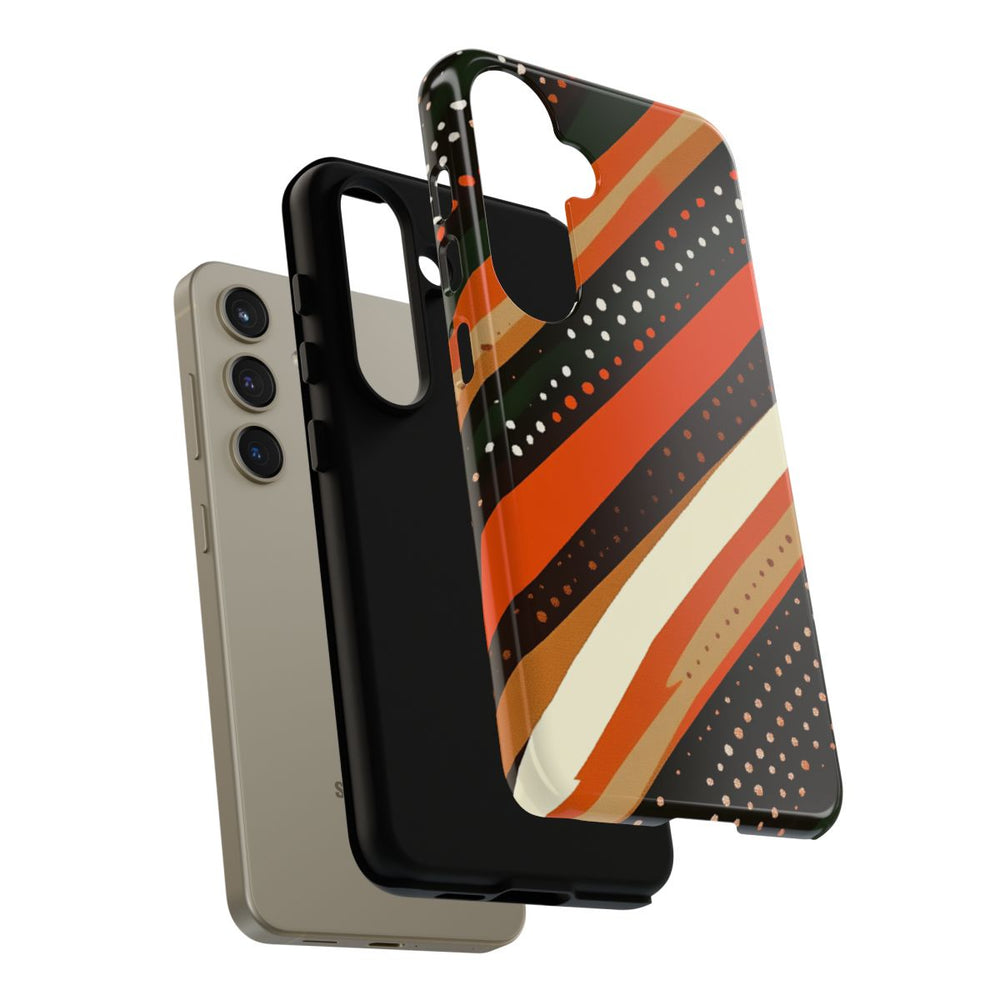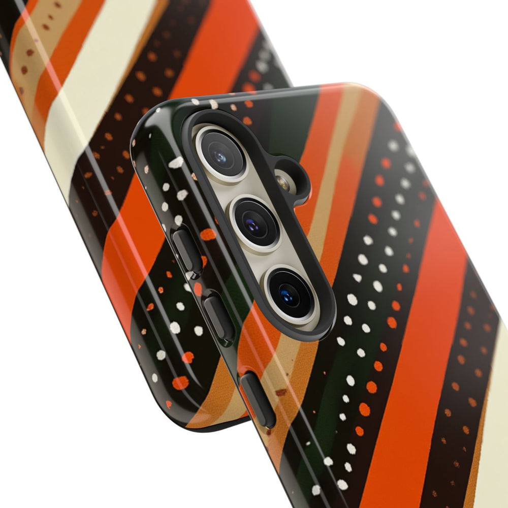 Dit hoesje heeft een opvallend ontwerp met diagonale strepen in warme aardetinten zoals gebrand oranje, donkerbruin, bosgroen, beige en crème. De strepen verschillen in breedte en zijn versierd met kleine stippen in wit en oranje, wat zorgt voor een levendige, vintage uitstraling. Het patroon ademt een retro sfeer uit de jaren 70, gecombineerd met een eigentijdse twist. Het hoesje is uitgevoerd in een glanzende, stevige uitvoering met een buitenkant van polycarbonaat en een TPU-binnenzijde. Zo biedt het hoesje optimale bescherming dankzij de dubbele laag en is het geschikt voor draadloos opladen.