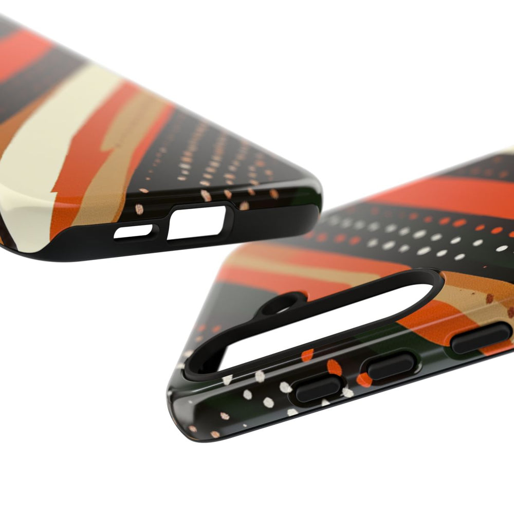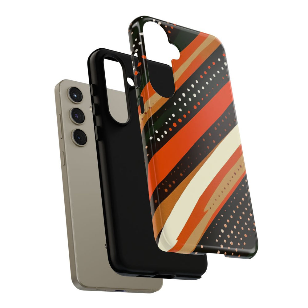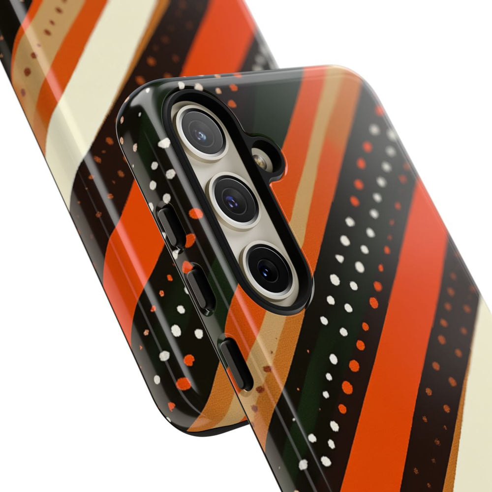 Dit hoesje heeft een opvallend ontwerp met diagonale strepen in warme aardetinten zoals gebrand oranje, donkerbruin, bosgroen, beige en crème. De strepen verschillen in breedte en zijn versierd met kleine stippen in wit en oranje, wat zorgt voor een levendige, vintage uitstraling. Het patroon ademt een retro sfeer uit de jaren 70, gecombineerd met een eigentijdse twist. Het hoesje is uitgevoerd in een glanzende, stevige uitvoering met een buitenkant van polycarbonaat en een TPU-binnenzijde. Zo biedt het hoesje optimale bescherming dankzij de dubbele laag en is het geschikt voor draadloos opladen.
