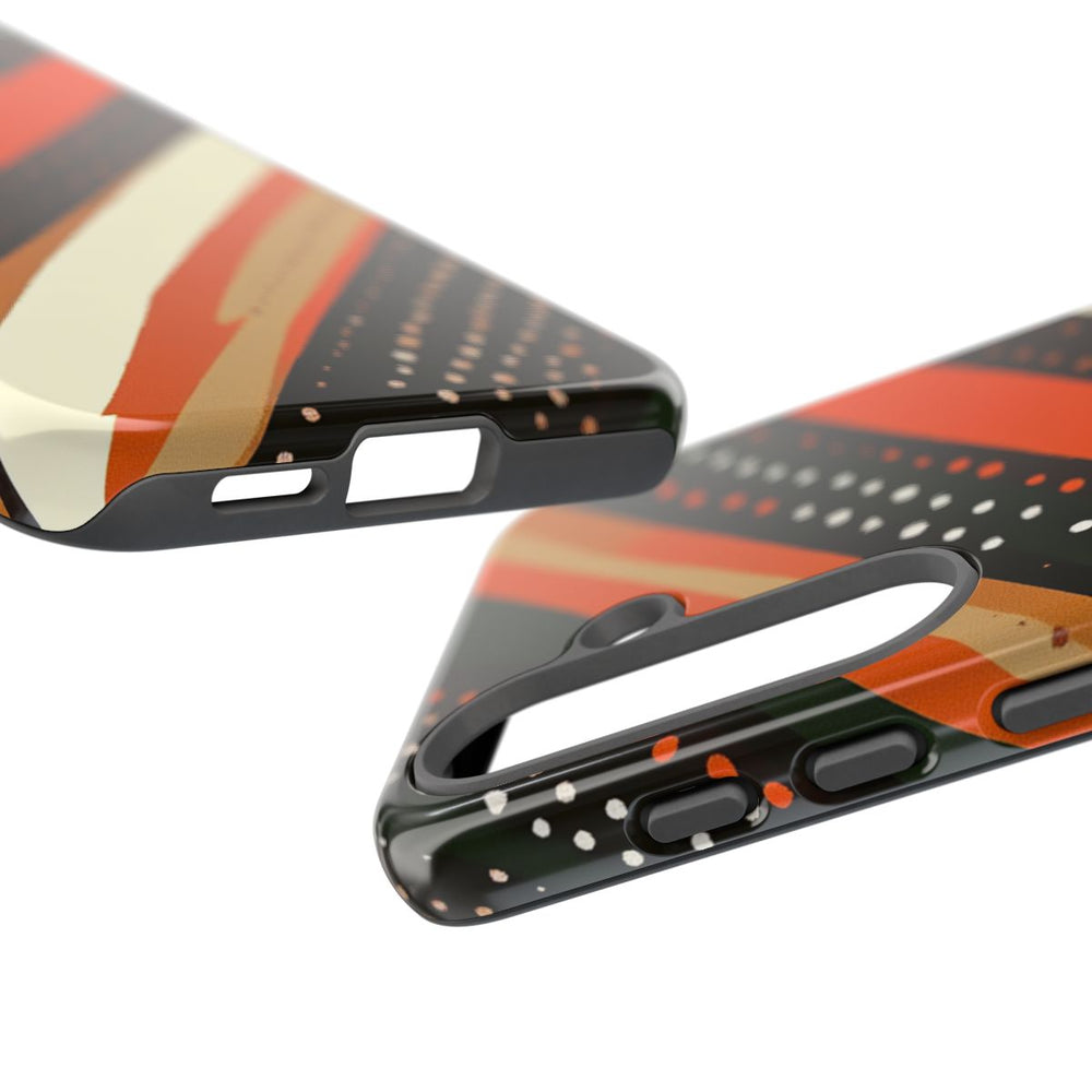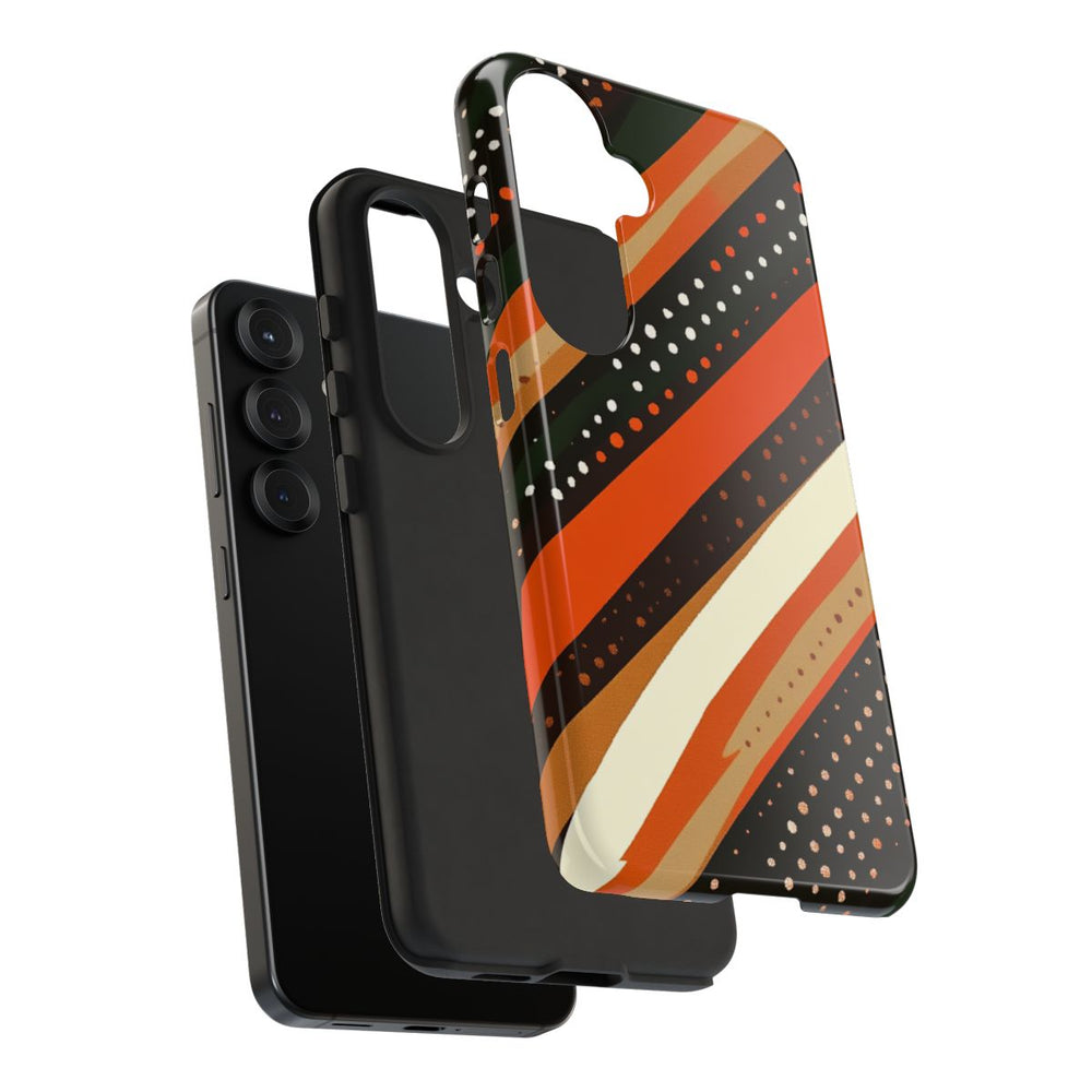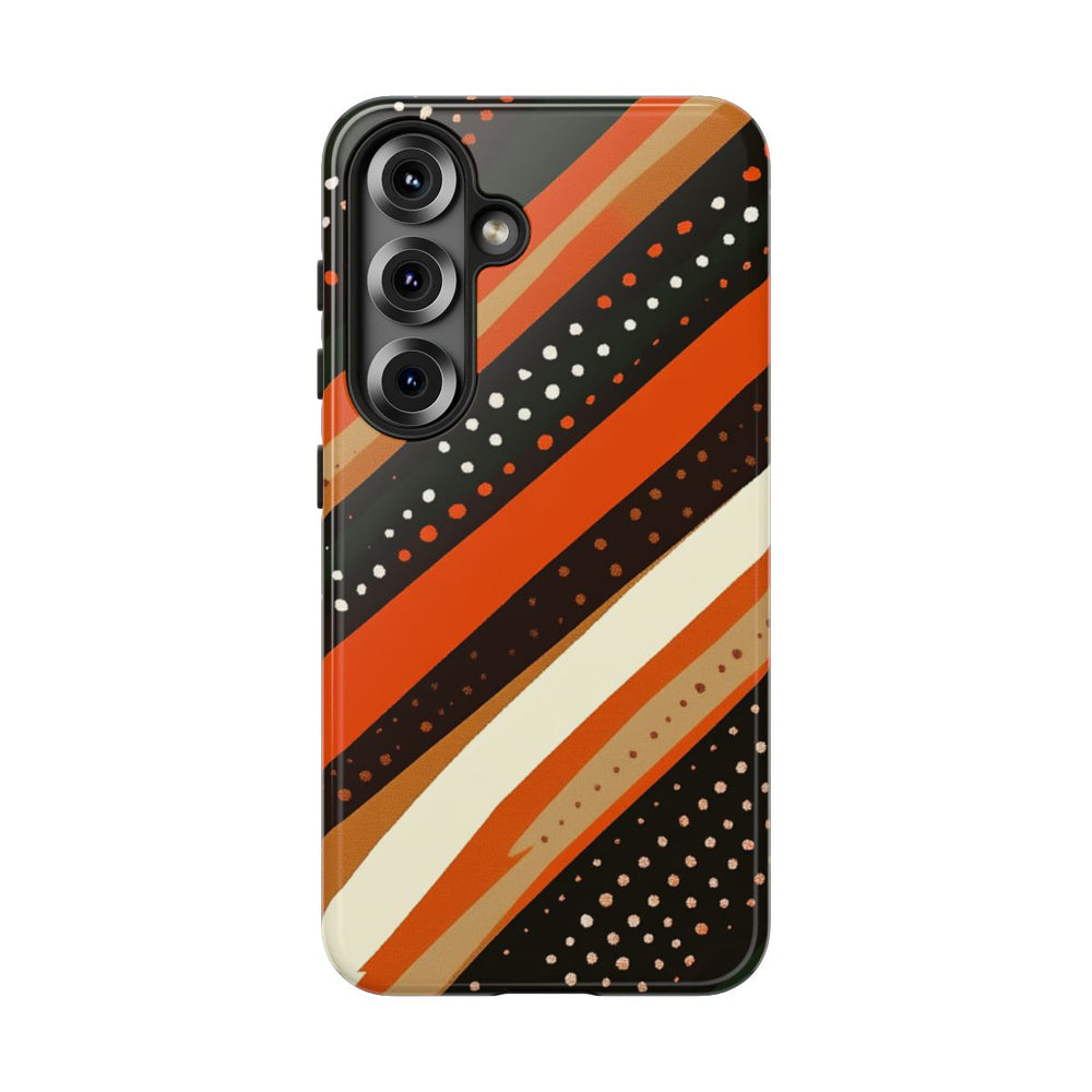 Dit hoesje heeft een opvallend ontwerp met diagonale strepen in warme aardetinten zoals gebrand oranje, donkerbruin, bosgroen, beige en crème. De strepen verschillen in breedte en zijn versierd met kleine stippen in wit en oranje, wat zorgt voor een levendige, vintage uitstraling. Het patroon ademt een retro sfeer uit de jaren 70, gecombineerd met een eigentijdse twist. Het hoesje is uitgevoerd in een glanzende, stevige uitvoering met een buitenkant van polycarbonaat en een TPU-binnenzijde. Zo biedt het hoesje optimale bescherming dankzij de dubbele laag en is het geschikt voor draadloos opladen.