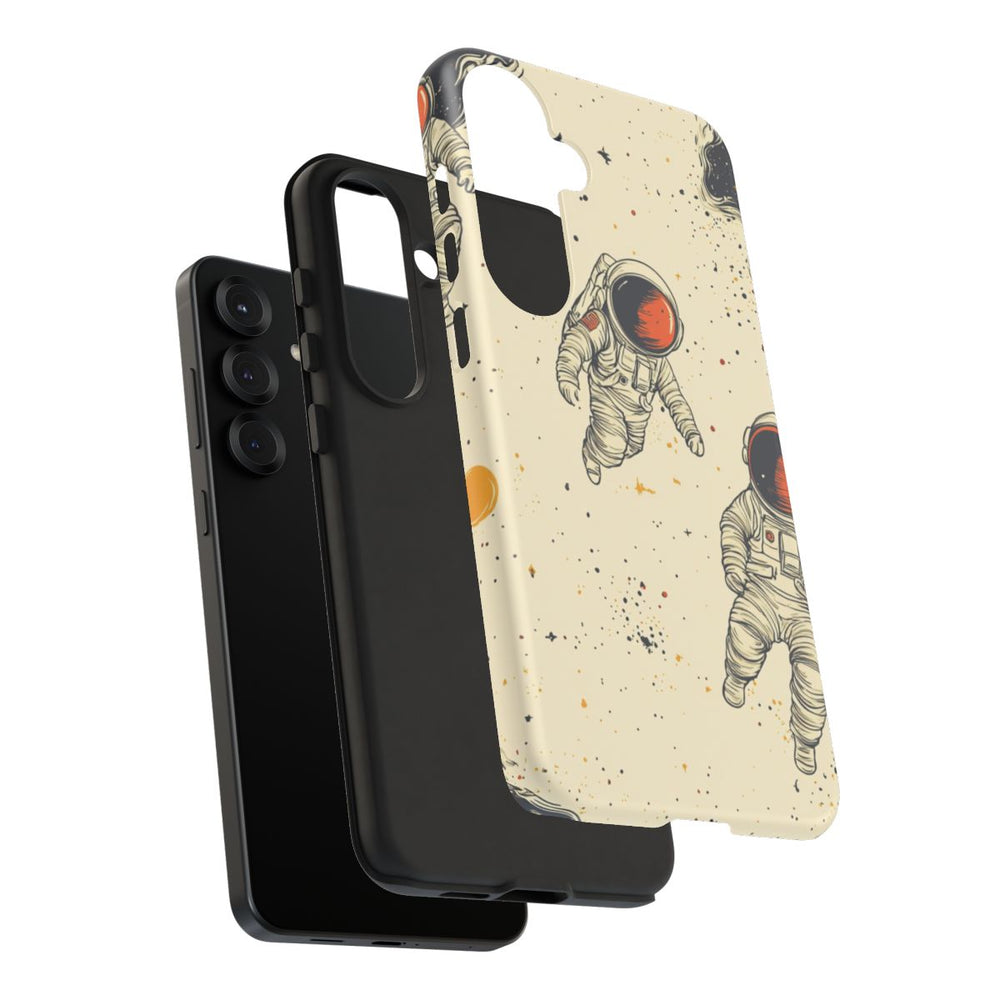 Dit telefoonhoesje is voorzien van een herhalend patroon met astronauten in retrostijl die door de ruimte zweven. De achtergrond heeft een lichte beige kleur met verspreide sterren en kleine hemellichamen in zwart en oranje. Donkere, onregelmatige vormen die doen denken aan verre sterrenstelsels of nevels zorgen voor extra contrast. De astronauten hebben oranje vizieren en gedetailleerde pakken met zichtbare lijnen en emblemen. Het hoesje bestaat uit twee lagen: een stevige polycarbonaat buitenkant en een TPU-binnenzijde. Ondersteunt draadloos opladen.