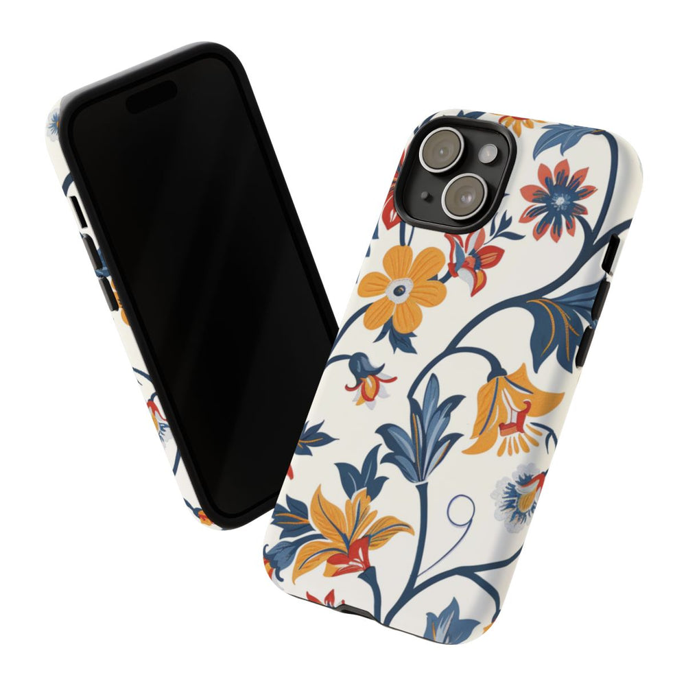 Dit telefoonhoesje heeft een opvallend retro bloemenpatroon met diverse gestileerde bloemen en bladeren in tinten blauw, rood en geel. De bloemen zijn met elkaar verbonden door sierlijke stelen en komen mooi uit tegen een witte achtergrond, wat zorgt voor een naadloos en levendig behang-effect. Het patroon is gedrukt op een mat hoesje van stevig polycarbonaat met een TPU-binnenkant, waardoor je telefoon extra goed beschermd is en draadloos opladen mogelijk blijft. Het kleurrijke en dynamische ontwerp is perfect voor liefhebbers van vintage bloemenmotieven.