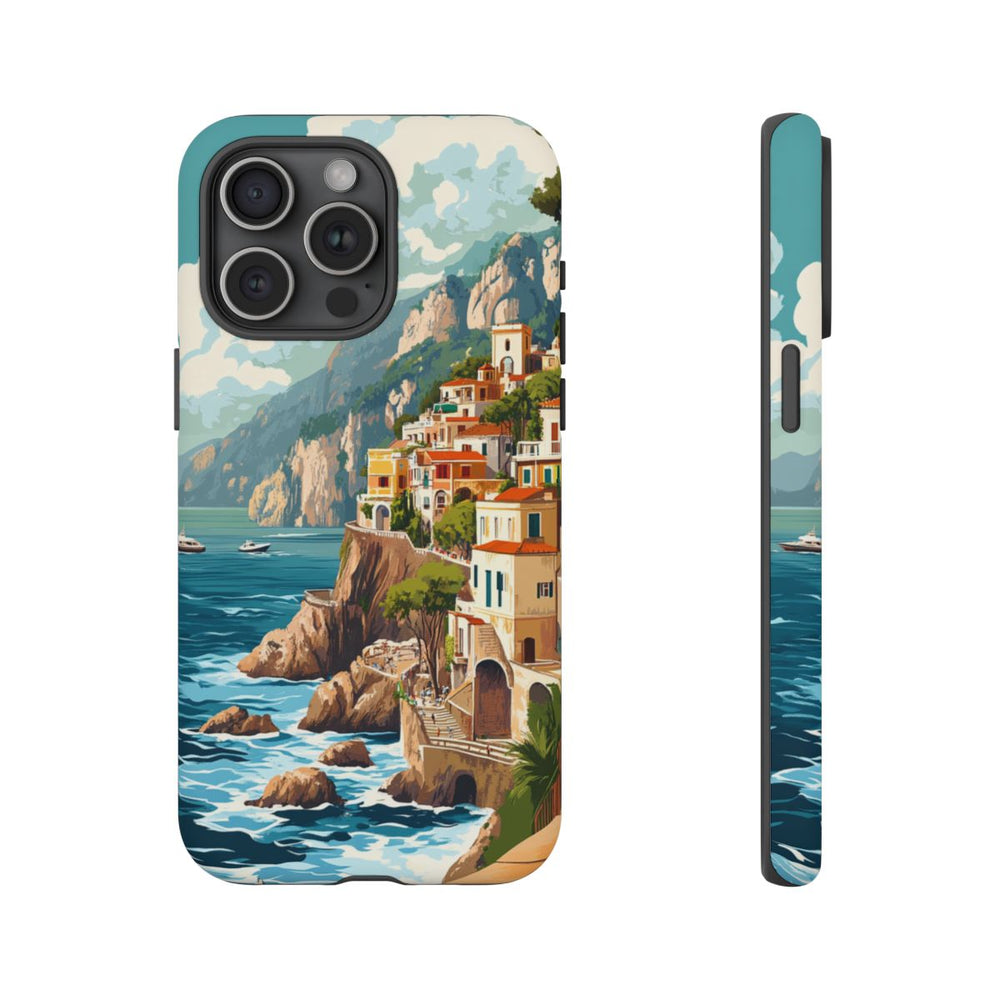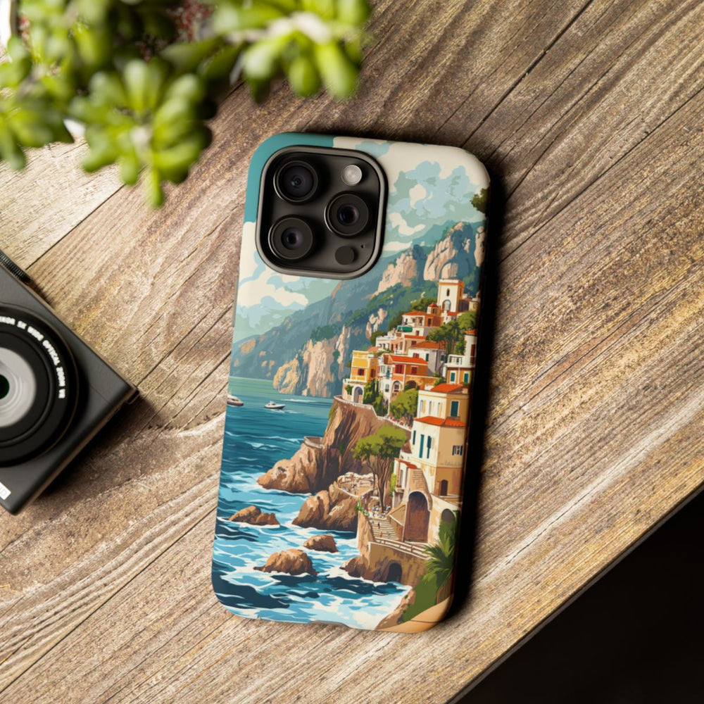 Dit telefoonhoesje is voorzien van een levendige retro illustratie van de Amalfikust, met kleurrijke gebouwen op rotsachtige kliffen boven een kalme, blauwe zee. Op de afbeelding varen bootjes over het water en is er weelderig groen langs de kustlijn te zien, allemaal onder een heldere lucht met witte wolken. Het ontwerp brengt de schoonheid en charme van deze bekende Italiaanse kuststreek tot leven en is daarmee een prachtige keuze voor je telefoon. Het stevige hoesje is gemaakt van duurzame materialen en ondersteunt draadloos opladen.