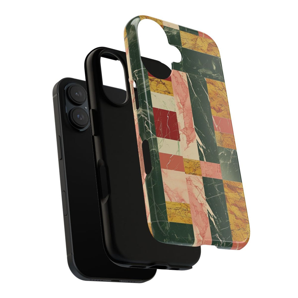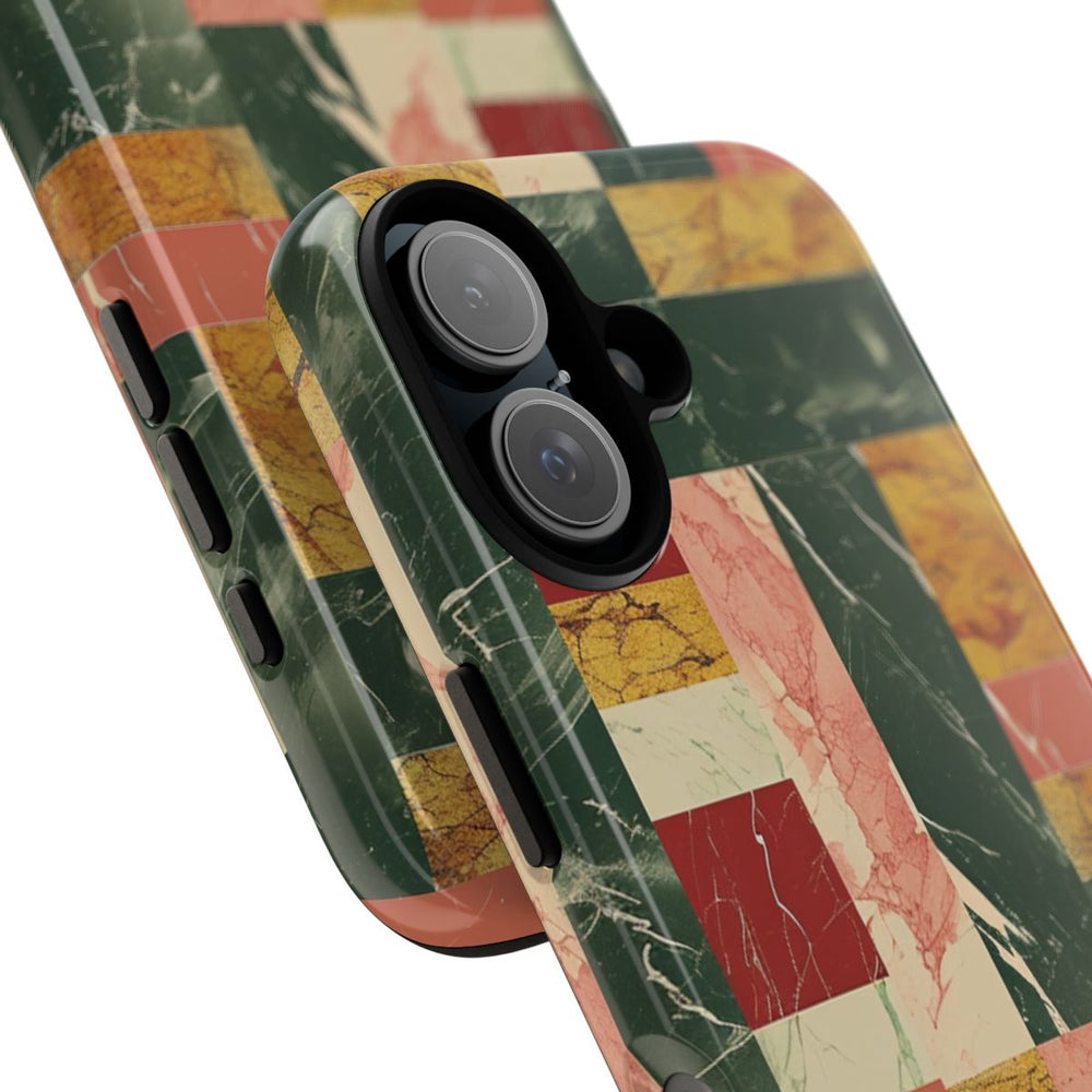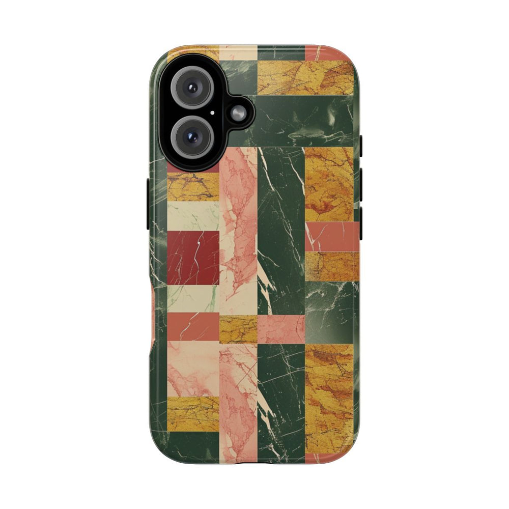 Dit telefoonhoesje heeft een retro marmerpatroon met rechthoekige en vierkante blokken in verschillende kleuren. De blokken zijn uitgevoerd in diepgroen, mosterdgeel, zachtroze, crème en baksteenrood, elk voorzien van een unieke marmerstructuur en nerf. Het patroon is geometrisch en als tegels gerangschikt, wat zorgt voor een opvallende en vintage uitstraling. Het hoesje is glanzend en stevig, gemaakt van polycarbonaat en TPU voor dubbele bescherming en is geschikt voor draadloos opladen.