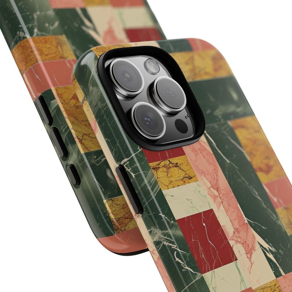 Dit telefoonhoesje heeft een retro marmerpatroon met rechthoekige en vierkante blokken in verschillende kleuren. De blokken zijn uitgevoerd in diepgroen, mosterdgeel, zachtroze, crème en baksteenrood, elk voorzien van een unieke marmerstructuur en nerf. Het patroon is geometrisch en als tegels gerangschikt, wat zorgt voor een opvallende en vintage uitstraling. Het hoesje is glanzend en stevig, gemaakt van polycarbonaat en TPU voor dubbele bescherming en is geschikt voor draadloos opladen.