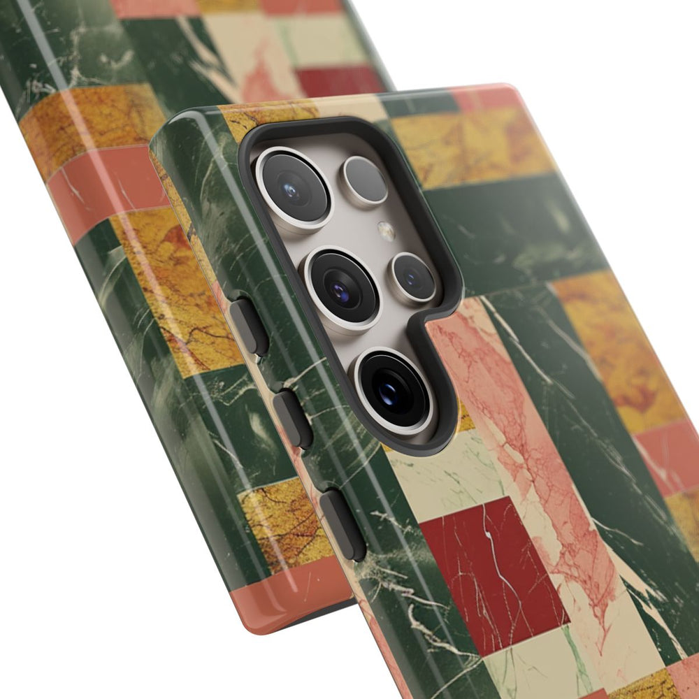 Dit telefoonhoesje heeft een retro marmerpatroon met rechthoekige en vierkante blokken in verschillende kleuren. De blokken zijn uitgevoerd in diepgroen, mosterdgeel, zachtroze, crème en baksteenrood, elk voorzien van een unieke marmerstructuur en nerf. Het patroon is geometrisch en als tegels gerangschikt, wat zorgt voor een opvallende en vintage uitstraling. Het hoesje is glanzend en stevig, gemaakt van polycarbonaat en TPU voor dubbele bescherming en is geschikt voor draadloos opladen.
