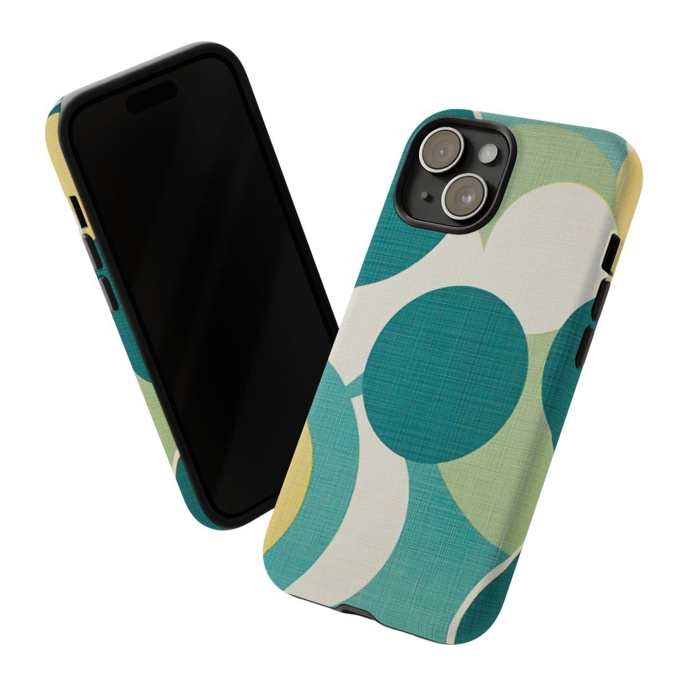 Dit telefoonhoesje heeft een retro geïnspireerd patroon van overlappende cirkels in blauwgroen, geel, wit en lichtgroen. De cirkels verschillen in grootte en zijn geplaatst op een achtergrond met een textuur die doet denken aan stof. Het abstracte en levendige ontwerp zorgt voor een opvallende en dynamische uitstraling. Het matte hoesje is gemaakt van een stevige polycarbonaat buitenkant met een TPU binnenzijde, waardoor het optimale bescherming biedt en geschikt is voor draadloos opladen.