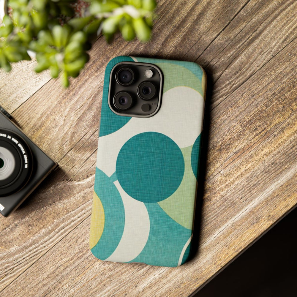 Dit telefoonhoesje heeft een retro geïnspireerd patroon van overlappende cirkels in blauwgroen, geel, wit en lichtgroen. De cirkels verschillen in grootte en zijn geplaatst op een achtergrond met een textuur die doet denken aan stof. Het abstracte en levendige ontwerp zorgt voor een opvallende en dynamische uitstraling. Het matte hoesje is gemaakt van een stevige polycarbonaat buitenkant met een TPU binnenzijde, waardoor het optimale bescherming biedt en geschikt is voor draadloos opladen.