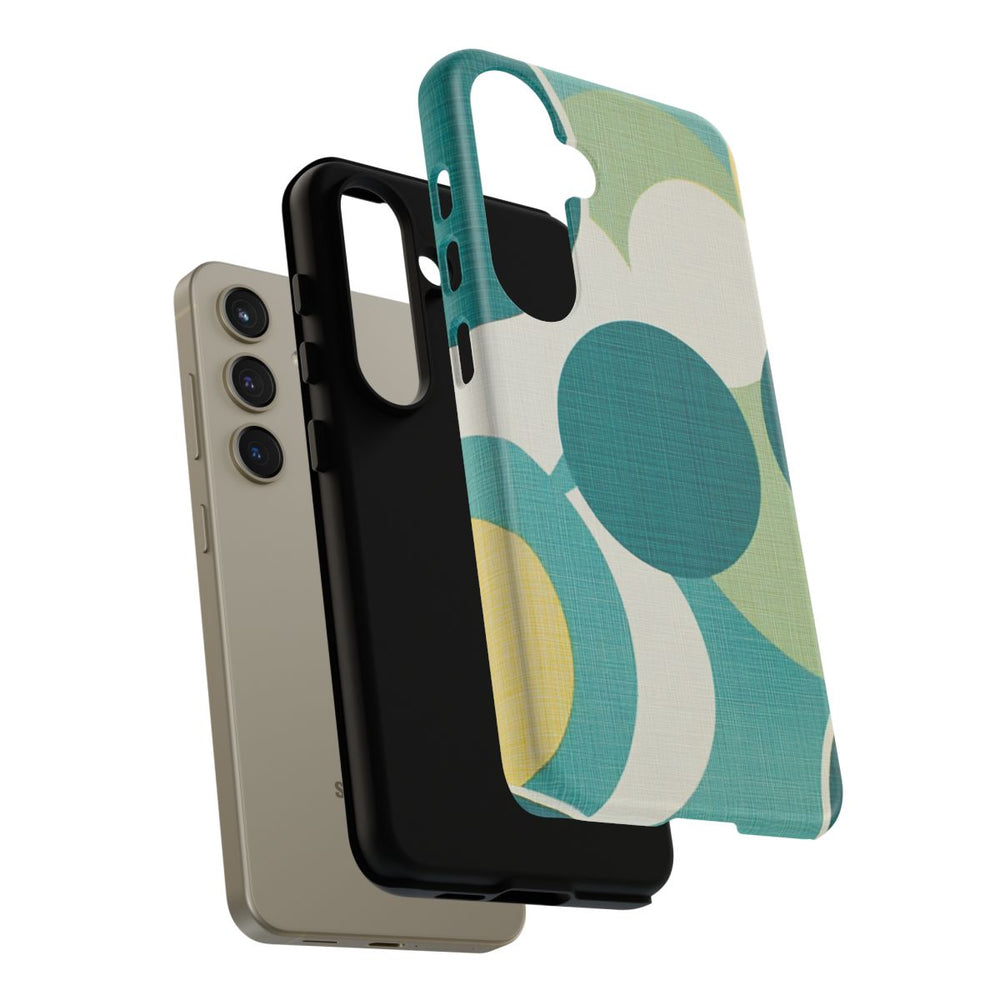 Dit telefoonhoesje heeft een retro geïnspireerd patroon van overlappende cirkels in blauwgroen, geel, wit en lichtgroen. De cirkels verschillen in grootte en zijn geplaatst op een achtergrond met een textuur die doet denken aan stof. Het abstracte en levendige ontwerp zorgt voor een opvallende en dynamische uitstraling. Het matte hoesje is gemaakt van een stevige polycarbonaat buitenkant met een TPU binnenzijde, waardoor het optimale bescherming biedt en geschikt is voor draadloos opladen.