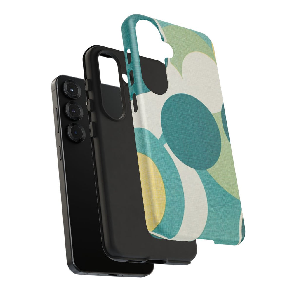 Dit telefoonhoesje heeft een retro geïnspireerd patroon van overlappende cirkels in blauwgroen, geel, wit en lichtgroen. De cirkels verschillen in grootte en zijn geplaatst op een achtergrond met een textuur die doet denken aan stof. Het abstracte en levendige ontwerp zorgt voor een opvallende en dynamische uitstraling. Het matte hoesje is gemaakt van een stevige polycarbonaat buitenkant met een TPU binnenzijde, waardoor het optimale bescherming biedt en geschikt is voor draadloos opladen.