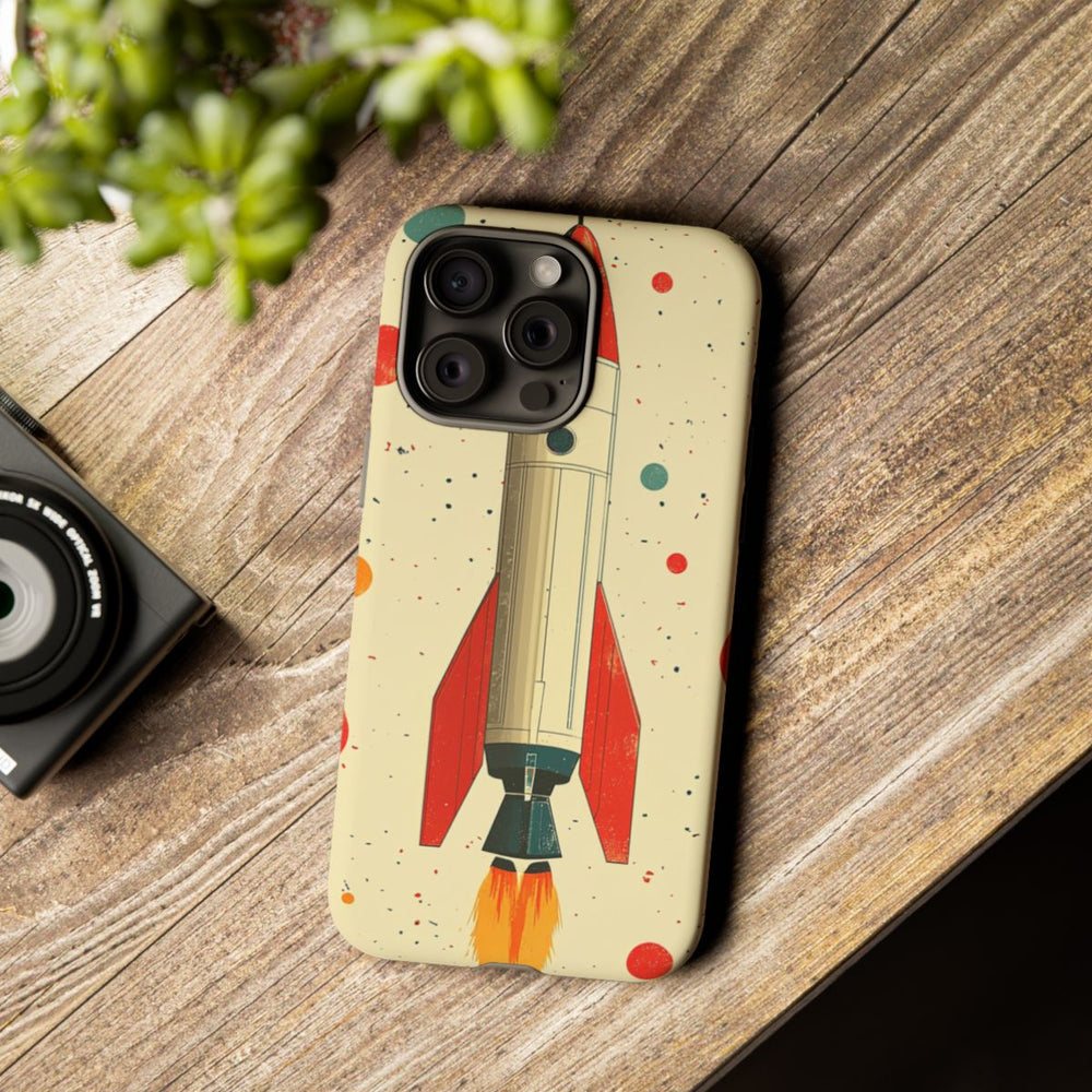 Dit telefoonhoesje heeft een herhalend patroon van raketten in retrostijl, met rode vinnen en neuzen, beige rompen en zwarte uitlaatstukken. De raketten stijgen op met oranje vlammen. De achtergrond is lichtbeige en versierd met verspreide rode, oranje en teal cirkels en kleine spikkels, wat zorgt voor een vintage ruimte-uitstraling. Het hoesje is dubbel gelaagd met een stevige polycarbonaat buitenkant en een TPU binnenzijde en ondersteunt draadloos opladen.