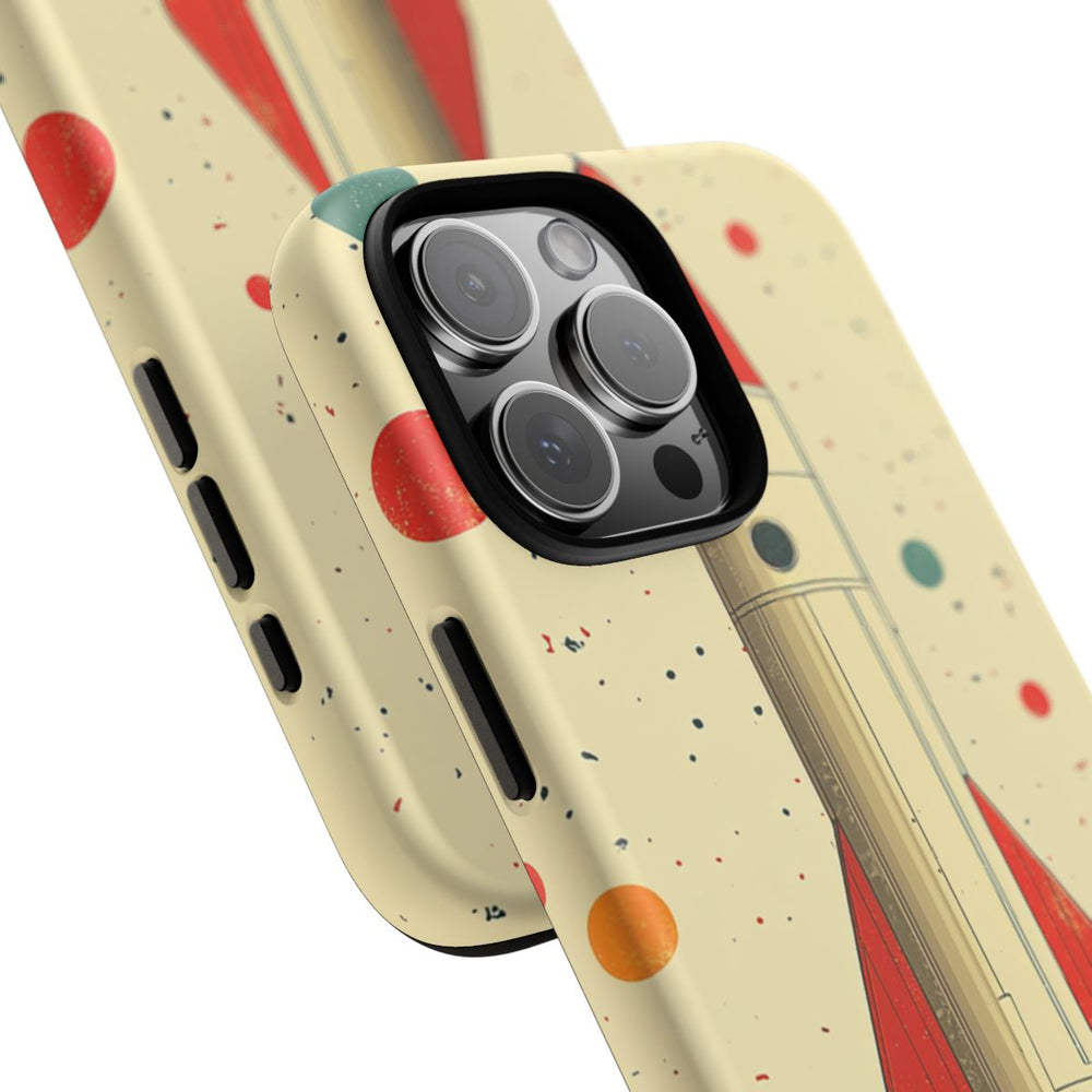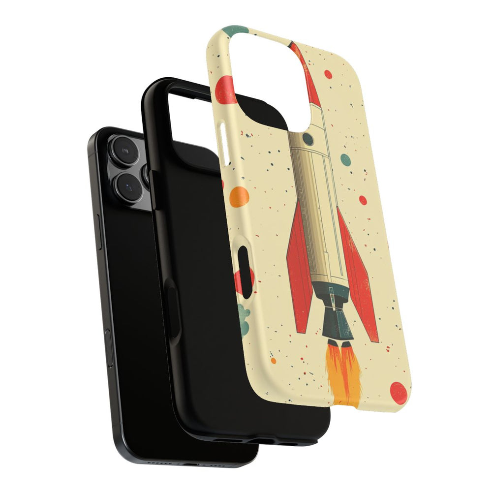 Dit hoesje heeft een herhalend patroon van raketten in vintage stijl, met rode vinnen en neuzen, beige rompen en donkerblauwe straalmotoren. De raketten zijn afgebeeld tijdens de lancering, met heldere oranje vlammen. De achtergrond is lichtbeige en versierd met cirkels in rood, oranje en blauwgroen, samen met kleine spikkels, wat zorgt voor een retro ruimte-uitstraling. Het hoesje bestaat uit twee lagen: een stevige polycarbonaat buitenkant en een TPU binnenzijde. Geschikt voor draadloos opladen.