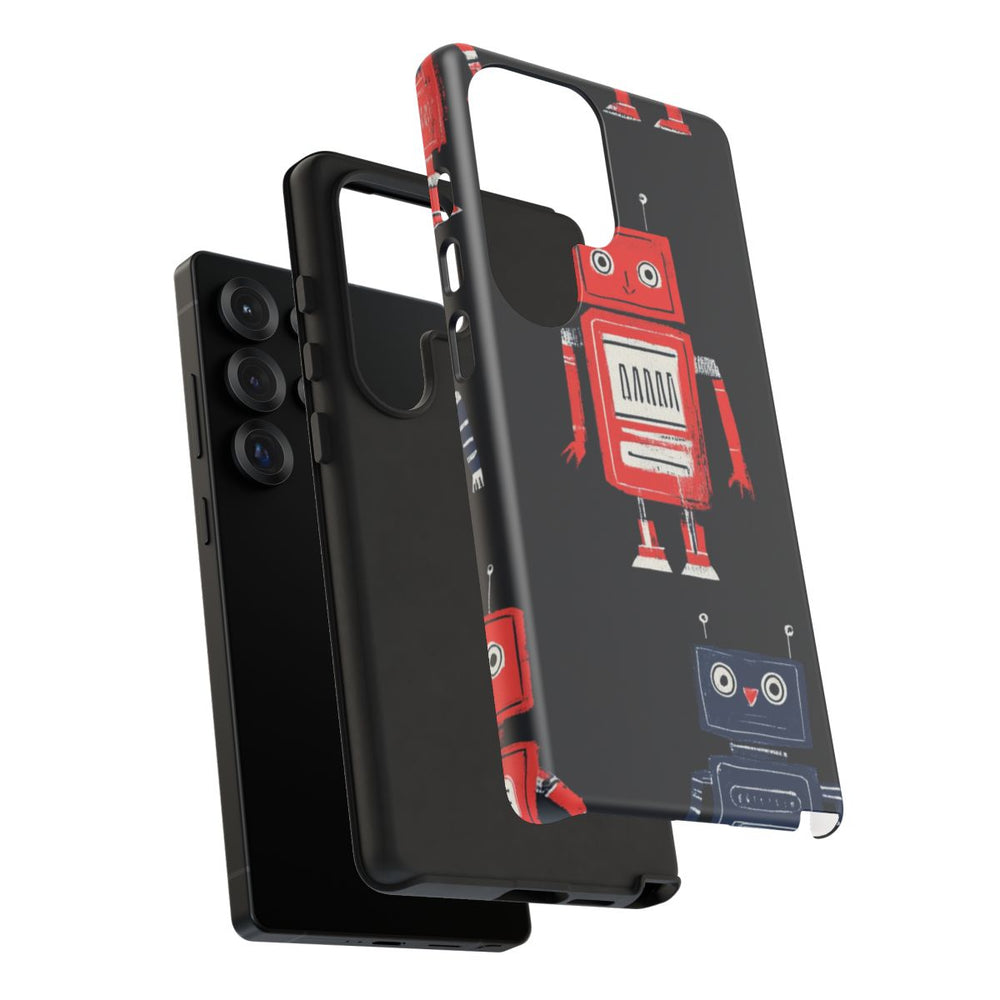 Dit ontwerp toont een herhalend patroon van retro-robots in helder rood, donkerblauw en wit op een effen zwarte achtergrond. De robots hebben een hoekige, met de hand getekende uitstraling met eenvoudige gezichten en antennes. Het naadloze patroon zorgt voor een speelse en doorlopende look. Het hoesje bestaat uit twee lagen met een matte afwerking, gemaakt van polycarbonaat en een TPU-voering. Dit biedt extra stevigheid en bescherming, terwijl draadloos opladen mogelijk blijft.
