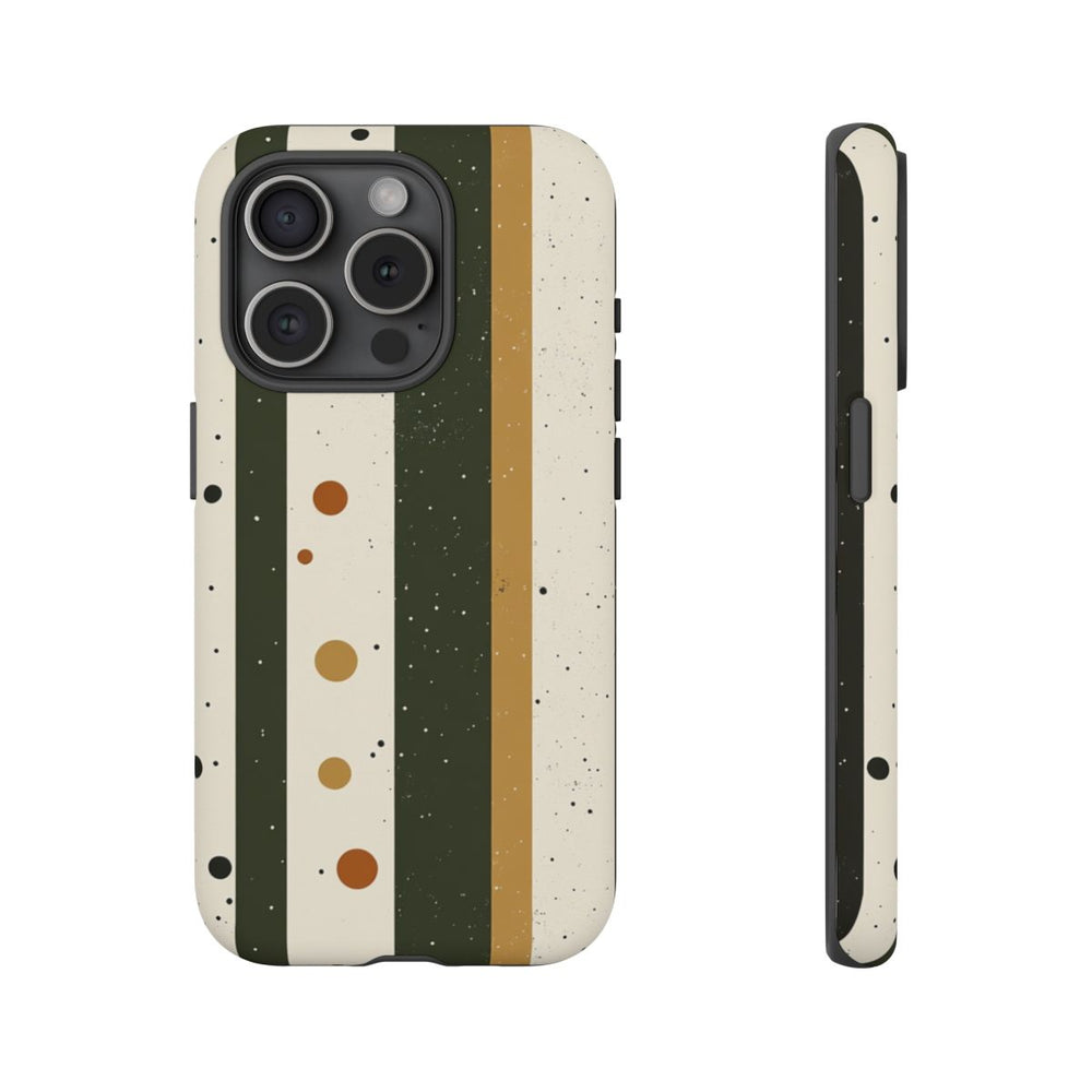 Dit telefoonhoesje heeft een retro ontwerp met verticale strepen in aardetinten zoals mokkabruin, gebrand oranje, bosgroen en taupe op een beige achtergrond. Het patroon is versierd met kleine en middelgrote stippen in zwarte en bruine tinten, wat zorgt voor een speelse, vintage uitstraling. De strepen verschillen in breedte en worden aangevuld met subtiele spikkels, waardoor het geheel een getextureerde, retro look krijgt. Het ontwerp is aangebracht op een stevig, mat hoesje met dubbele laag bescherming en ondersteuning voor draadloos opladen.
