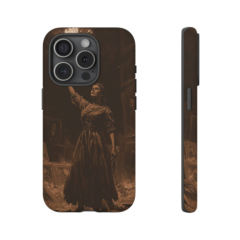 Deze afbeelding toont een vrouw die in het midden van een beschadigde kamer staat, omringd door kapotte meubels en verspreide fotolijsten. Ze houdt een felle fakkel hoog boven haar hoofd, waardoor de donkere ruimte wordt verlicht. De muren zijn bedekt met portretten, waarvan sommige gebarsten of gevallen zijn. Het kunstwerk is uitgevoerd in sepia-tinten, wat zorgt voor een historische en dramatische uitstraling. Het hoesje bestaat uit twee lagen: een stevige polycarbonaat buitenkant en een TPU binnenzijde. Dit ontwerp biedt optimale bescherming en is geschikt voor draadloos opladen.