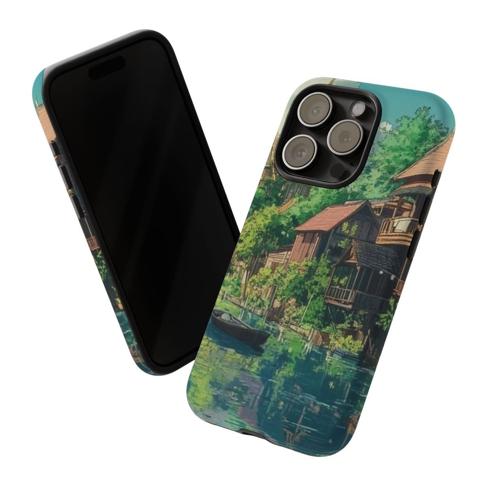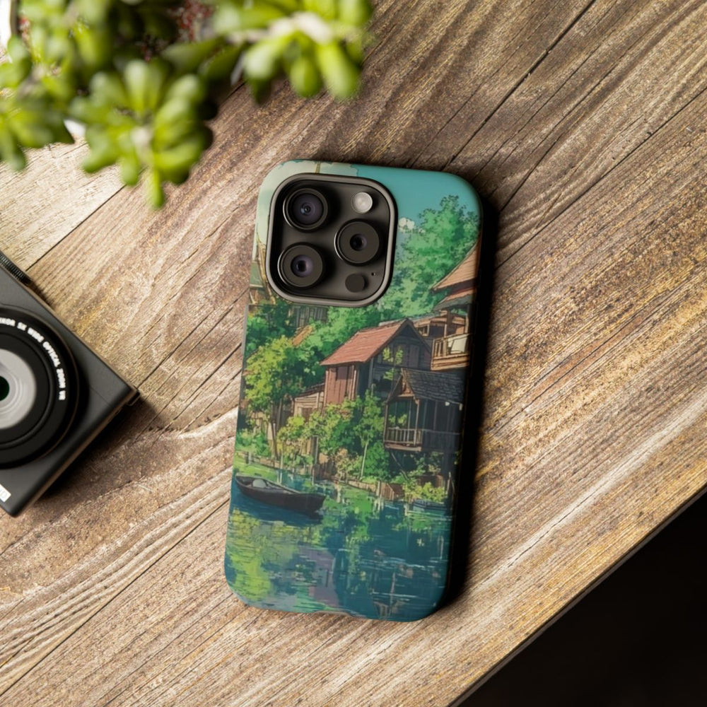Dit hoesje toont een rustgevend rivierlandschap met traditionele houten huizen langs de oever. Het water weerspiegelt de weelderig groene bomen en de gebouwen, waaronder een opvallende tempel met gouden torenspitsen op de achtergrond. De lucht is helder met enkele witte wolken en kleine bootjes drijven zachtjes op de kalme rivier. De afbeelding is gedetailleerd en kleurrijk en brengt een vredige, natuurlijke sfeer tot leven. Het hoesje heeft een stevige polycarbonaat buitenkant en een TPU binnenzijde, ondersteunt draadloos opladen en biedt extra bescherming.