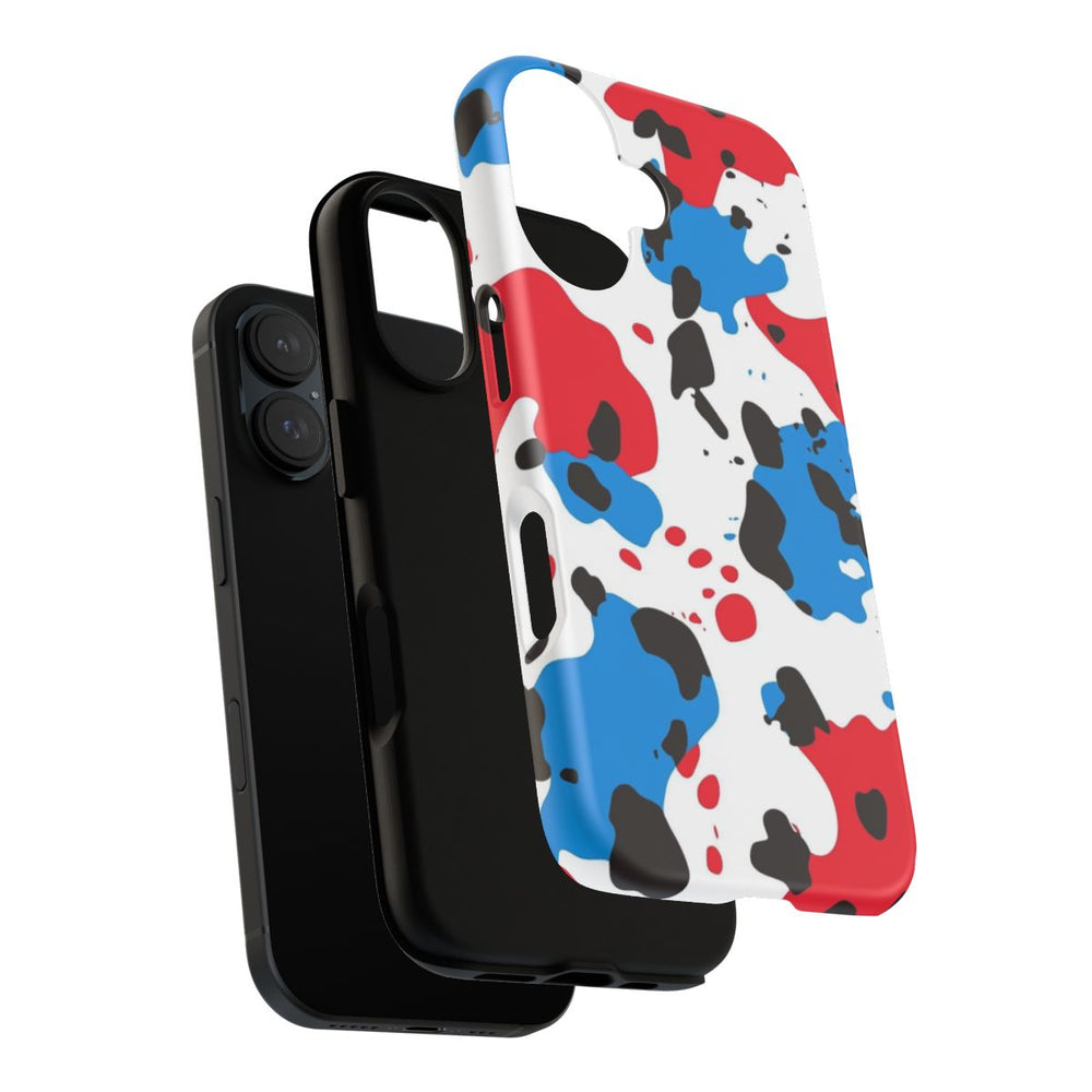 Dit telefoonhoesje heeft een abstract patroon van grote rode en blauwe vlekken, afgewisseld met kleinere zwarte stippen op een witte achtergrond. De vlekken verschillen in vorm en formaat, wat zorgt voor een levendige en kleurrijke uitstraling. Het matte hoesje is stevig uitgevoerd met een polycarbonaat buitenkant en een TPU-binnenzijde. Dankzij de dubbele beschermlaag is je telefoon optimaal beschermd, en draadloos opladen blijft gewoon mogelijk.