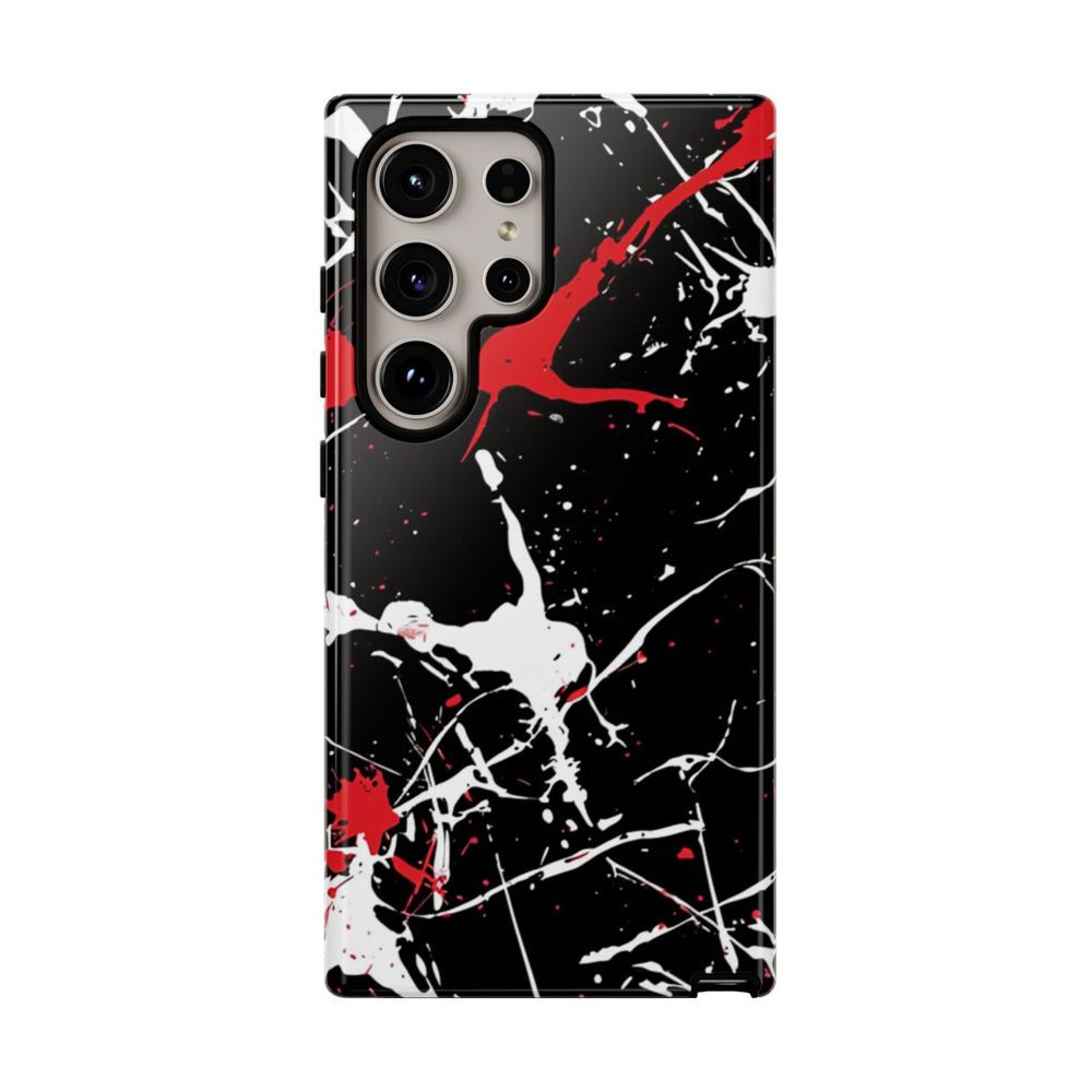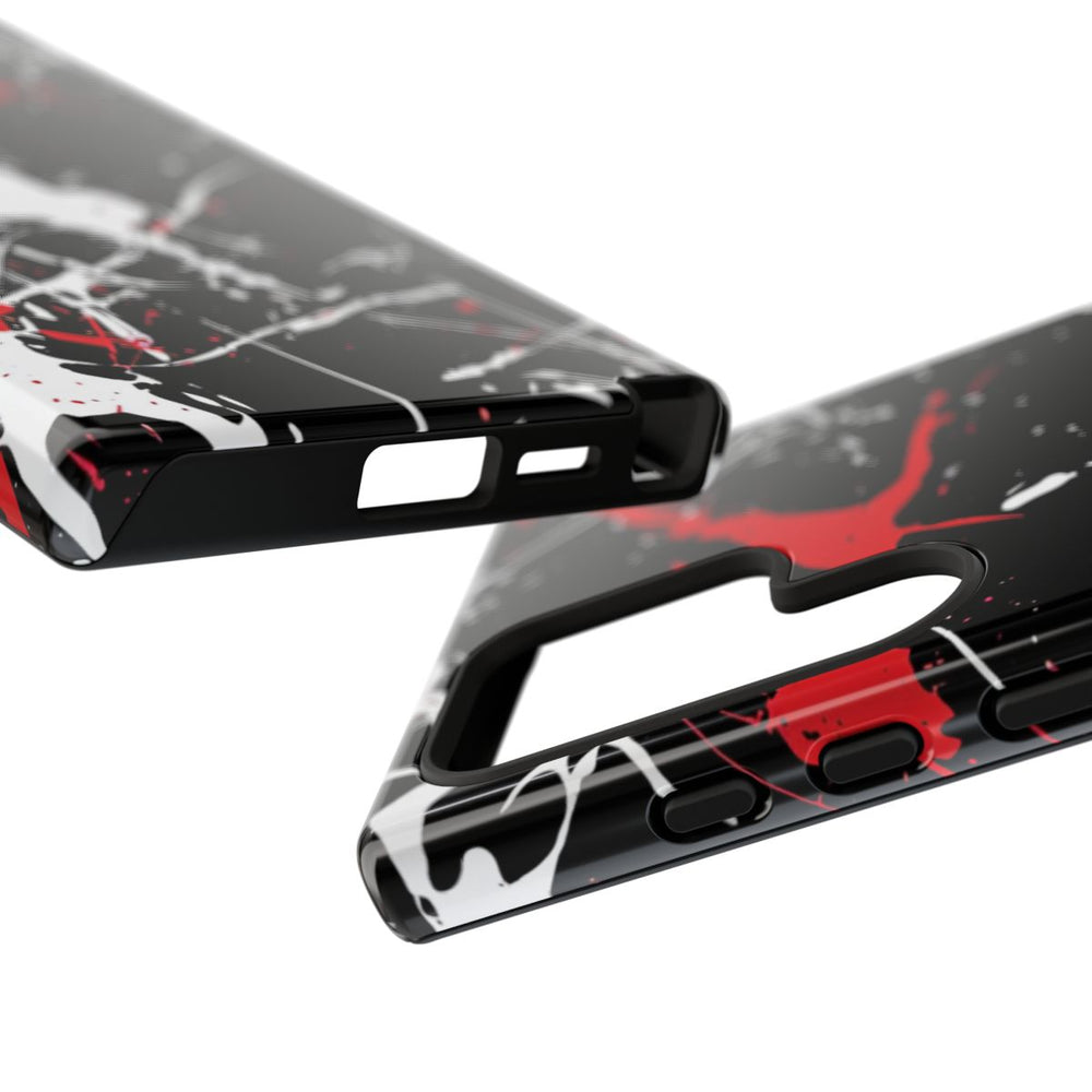 Dit hoesje heeft een opvallend ontwerp met rode en witte verfspatten op een diepzwarte achtergrond. De spetters verschillen in grootte en vorm, wat zorgt voor een levendig en abstract patroon. Het hoesje bestaat uit twee lagen: een glanzende buitenkant van polycarbonaat en een binnenzijde van TPU, wat zorgt voor extra stevigheid en bescherming. Het ondersteunt draadloos opladen en is bestand tegen weersinvloeden, zodat het hoesje langdurig mooi blijft.