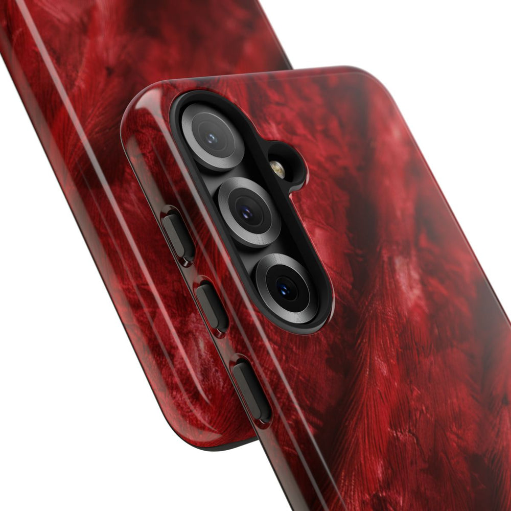 Dit hoesje heeft een rijke rode fluwelen textuur met zichtbare plooien en zachte, luxueuze stofdetails. Het ontwerp brengt de diepte en glans van fluweel prachtig in beeld, wat zorgt voor een elegante en tastbare uitstraling. Het hoesje is glanzend afgewerkt en bestaat uit twee lagen: een stevige polycarbonaat buitenkant en een schokabsorberende TPU binnenlaag voor extra bescherming. Geschikt voor draadloos opladen en bestand tegen weersinvloeden, terwijl de optische helderheid behouden blijft.