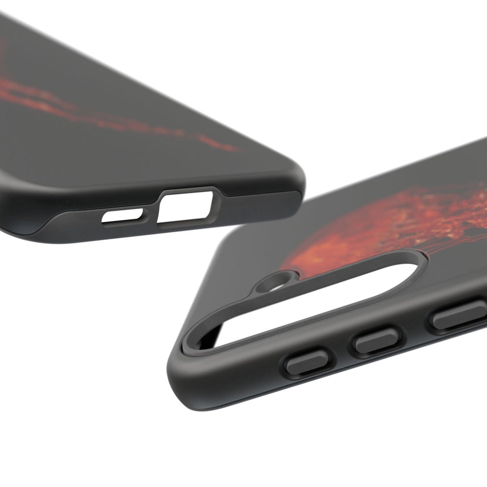Dit hoesje heeft een gedetailleerde rode kwal in het midden op een effen zwarte achtergrond. De kwal is afgebeeld met een ronde kap en sierlijke tentakels die naar beneden stromen, voorzien van verfijnde texturen en accenten. Het stevige hoesje bestaat uit twee lagen van polycarbonaat en TPU voor extra duurzaamheid en bescherming. Geschikt voor draadloos opladen en bestand tegen invloeden van buitenaf.