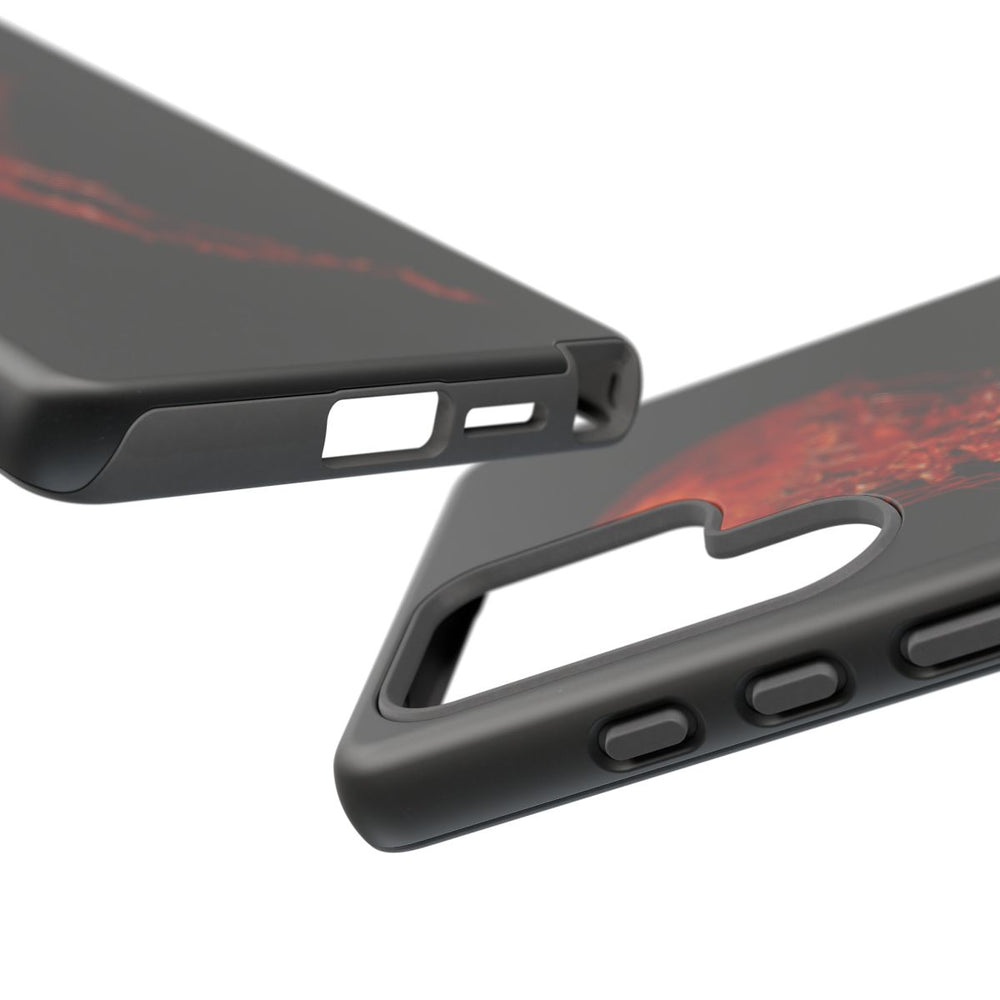 Dit ontwerp toont een gedetailleerde rode kwal die zweeft tegen een effen zwarte achtergrond. De kwal heeft een ronde koepel en lange, sierlijke tentakels met verfijnde texturen. De afbeelding is helder en minimalistisch, waarbij de levendige rode kleur van de kwal centraal staat. Het hoesje heeft een matte afwerking en is gemaakt van polycarbonaat en TPU. Dankzij de dubbele laag biedt het hoesje extra bescherming en is het geschikt voor draadloos opladen.